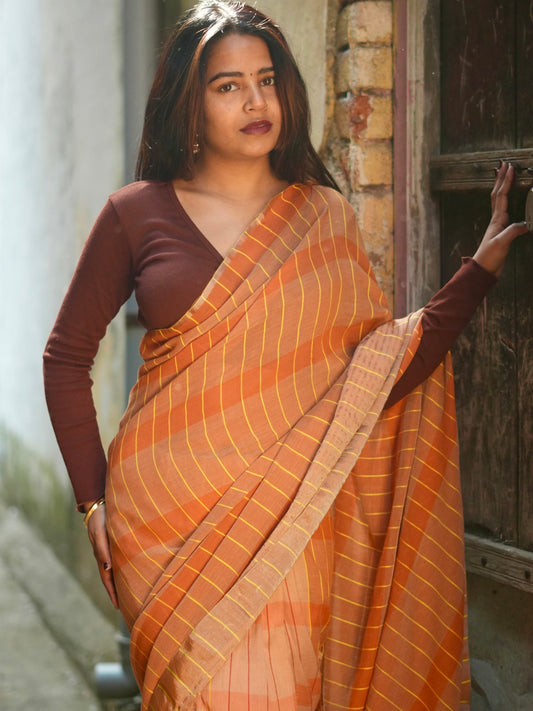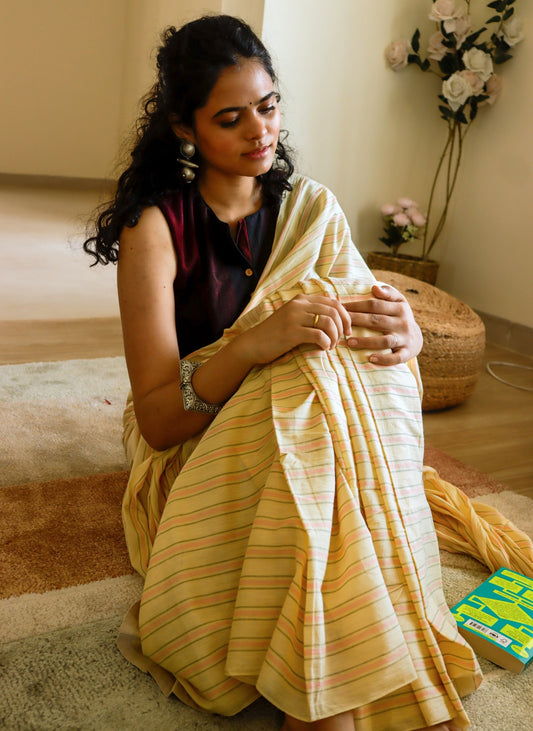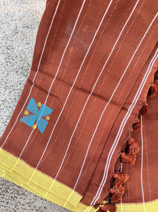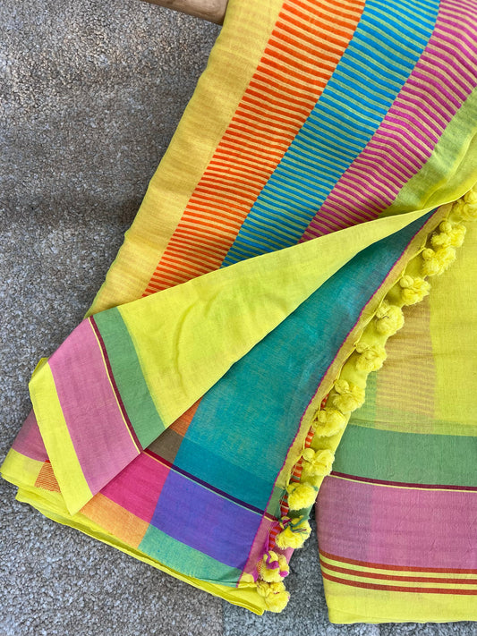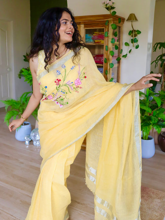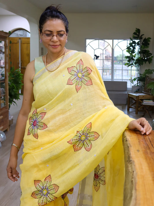 Keya Saree - Yellow Linen Large Lily Floral Embroidery Saree
