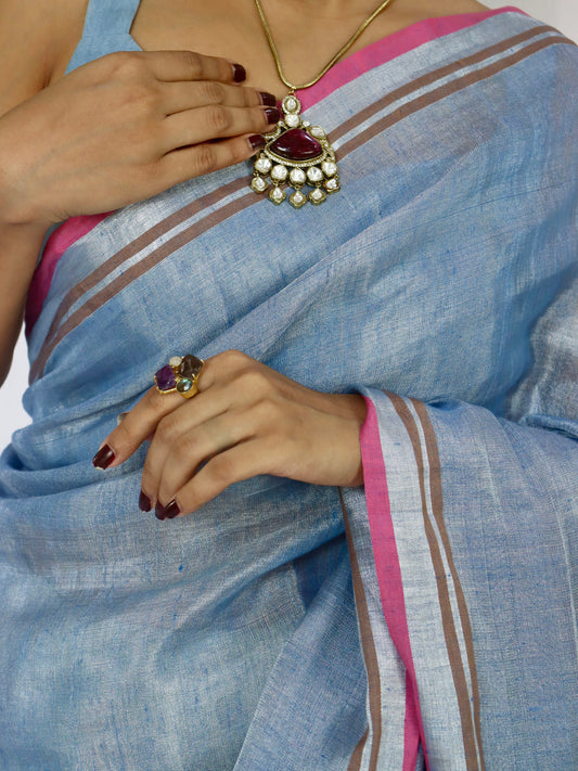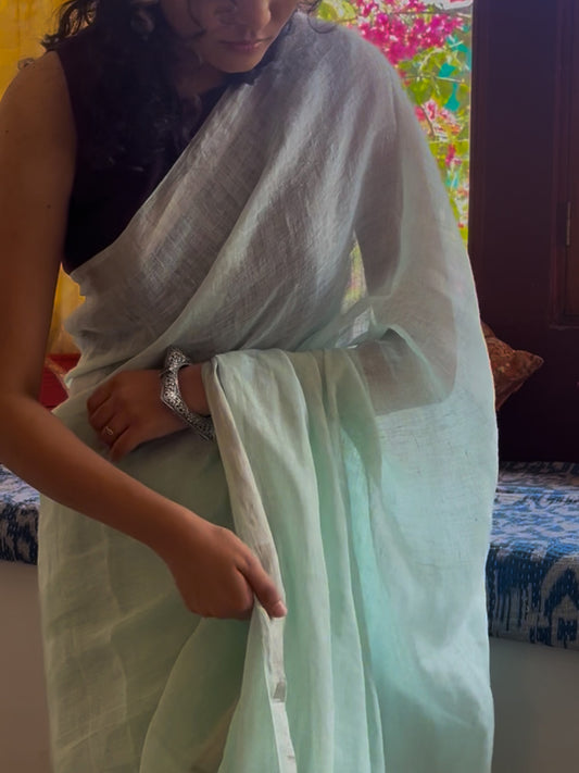 Nivedha - Ice Blue Linen Floral Embroidery Saree With Blouse Piece