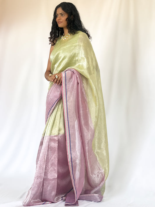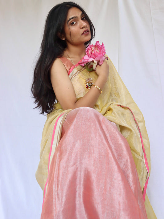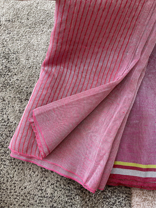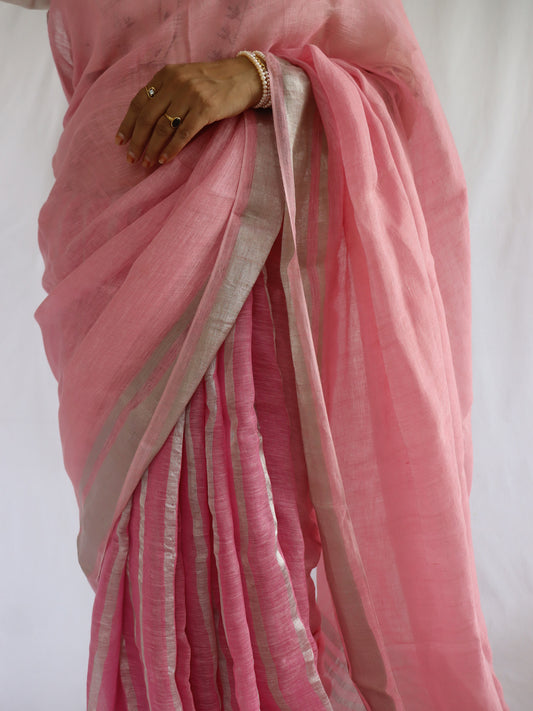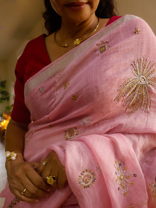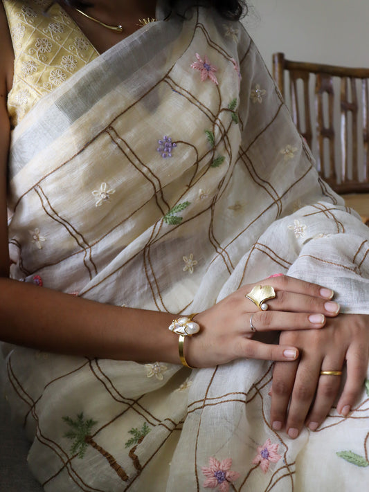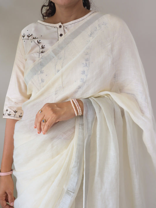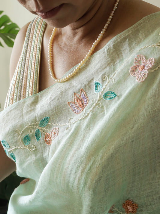 Saunira - Checkered & Floral Embroidered Linen Saree Dripping with Innocence