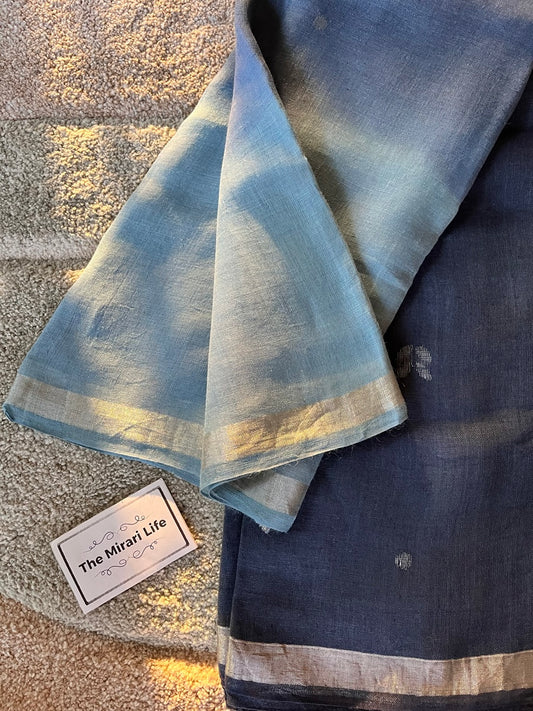 Sanjh - Dual Tone Blue Linen Dragonflies & Floral Embroidery Saree