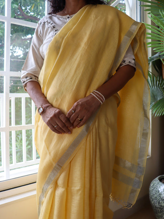 Keya Saree - Yellow Linen Large Lily Floral Embroidery Saree