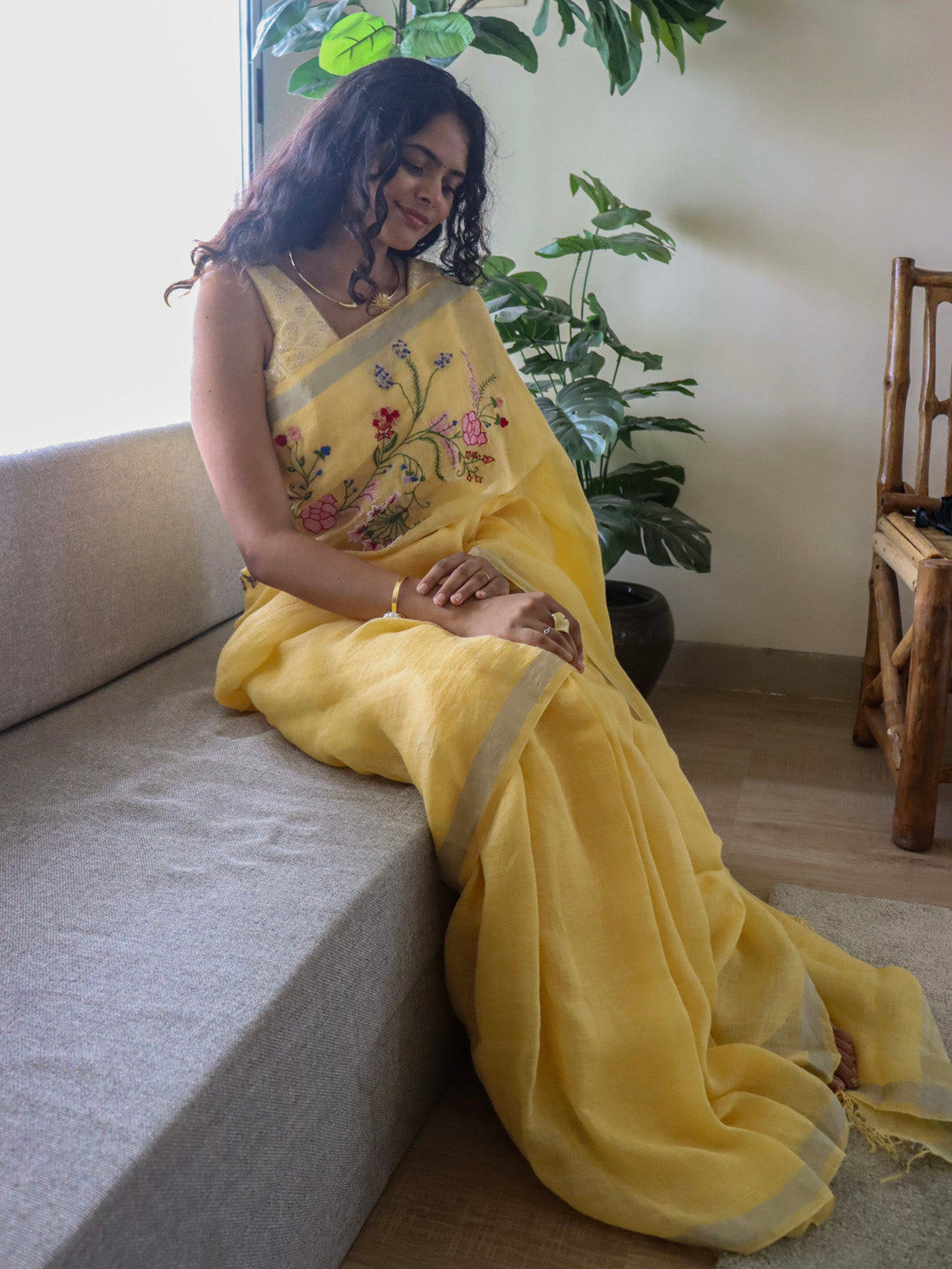 Woven in pure natural linen, these sarees are soft, breezy, and full of charm.