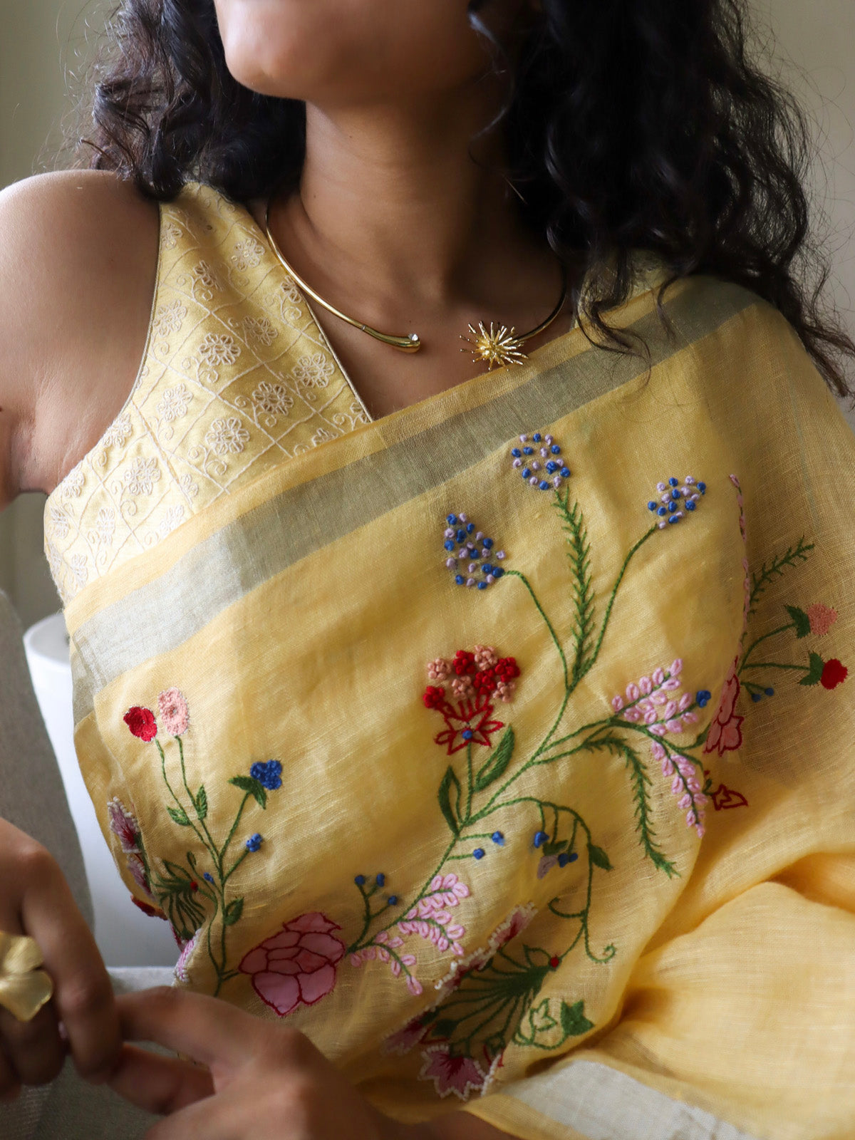 Adira, meaning strong and graceful, is like a sunlit garden come alive. Drenched in a radiant yellow, this saree carries delicate hand-embroidered floral vines that seem to grow and flow organically across its drape—each stitch a quiet testament to time, patience, and tradition. It’s a piece that brings warmth, joy, and effortless elegance to the woman who wears it. Like sunshine on skin, Adira feels like hope wrapped in thread.