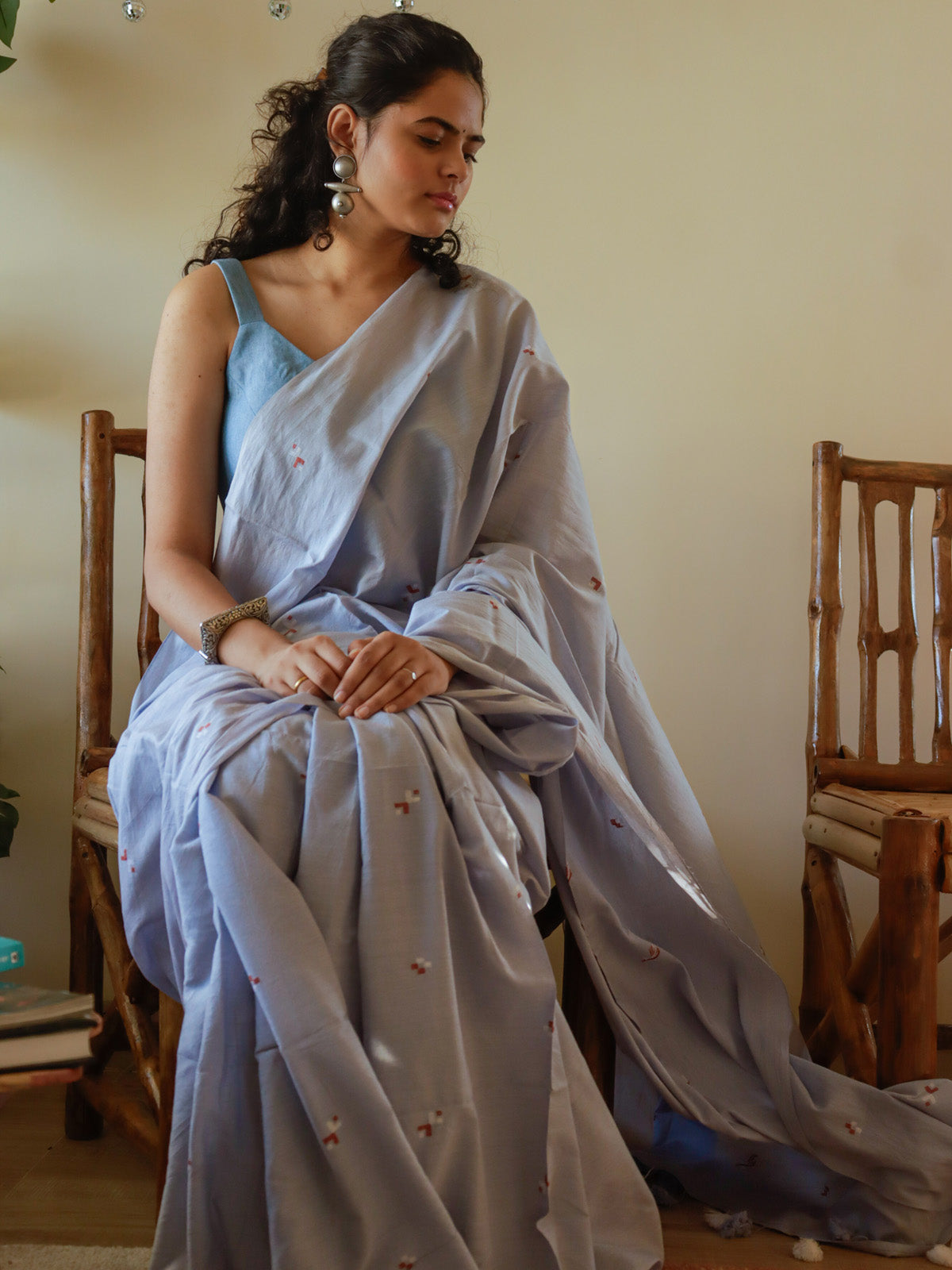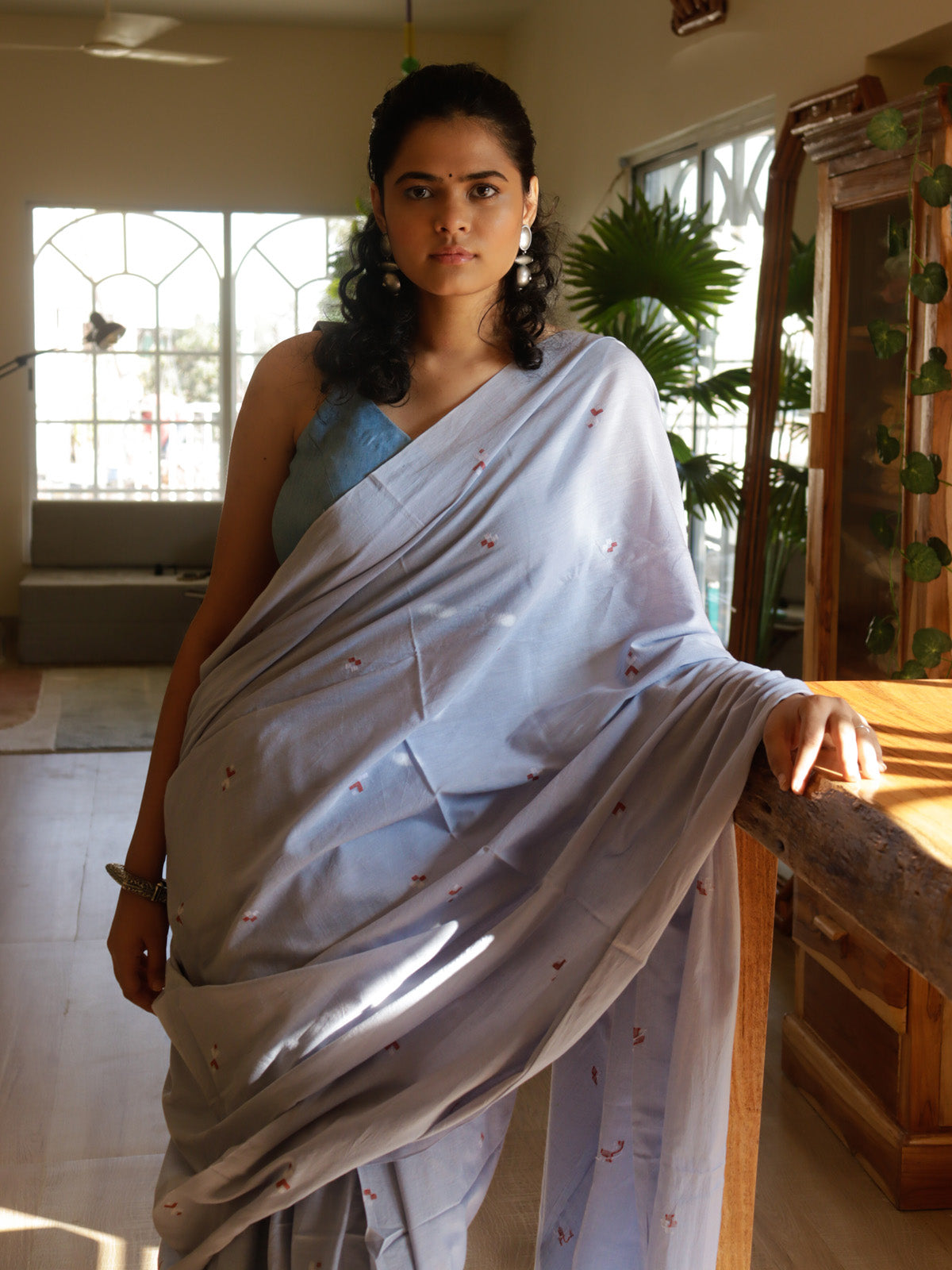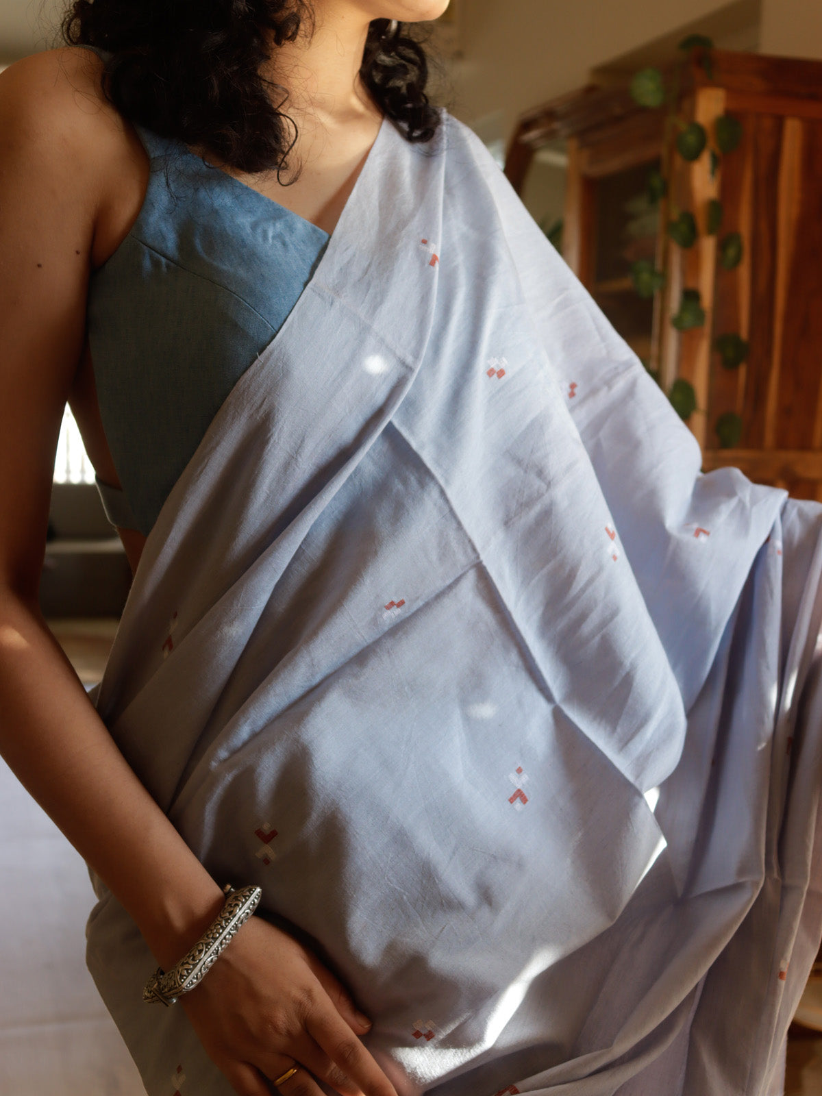 This Airy blue cotton saree is a tribute to slow, sunlit days and cool sips of comfort. Woven with dainty geometric Jamdani motifs inspired by ice cubes and chilled drinks, it blends tradition with a playful, modern charm. The soft fabric drapes effortlessly, making it perfect for breezy days and laid-back gatherings. Refreshing, subtle, and full of personality — it’s a saree that feels like summer in motion.