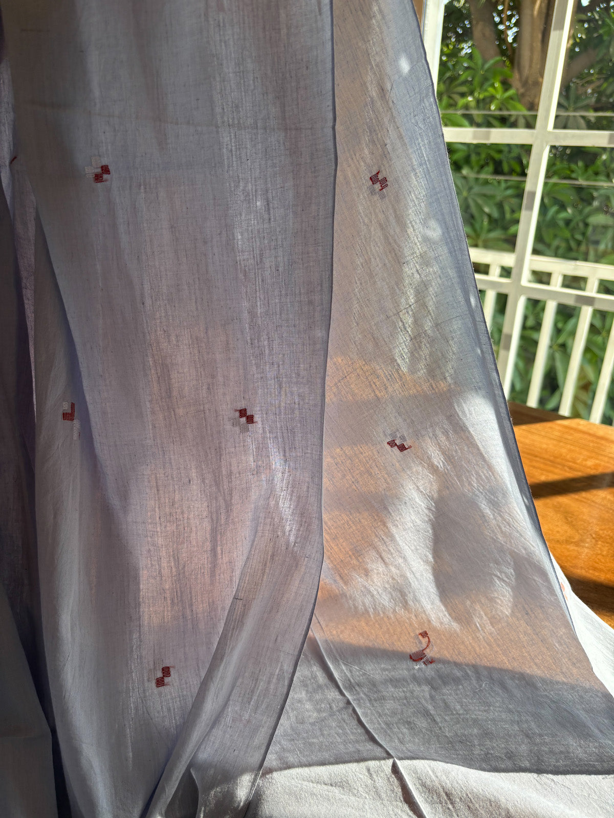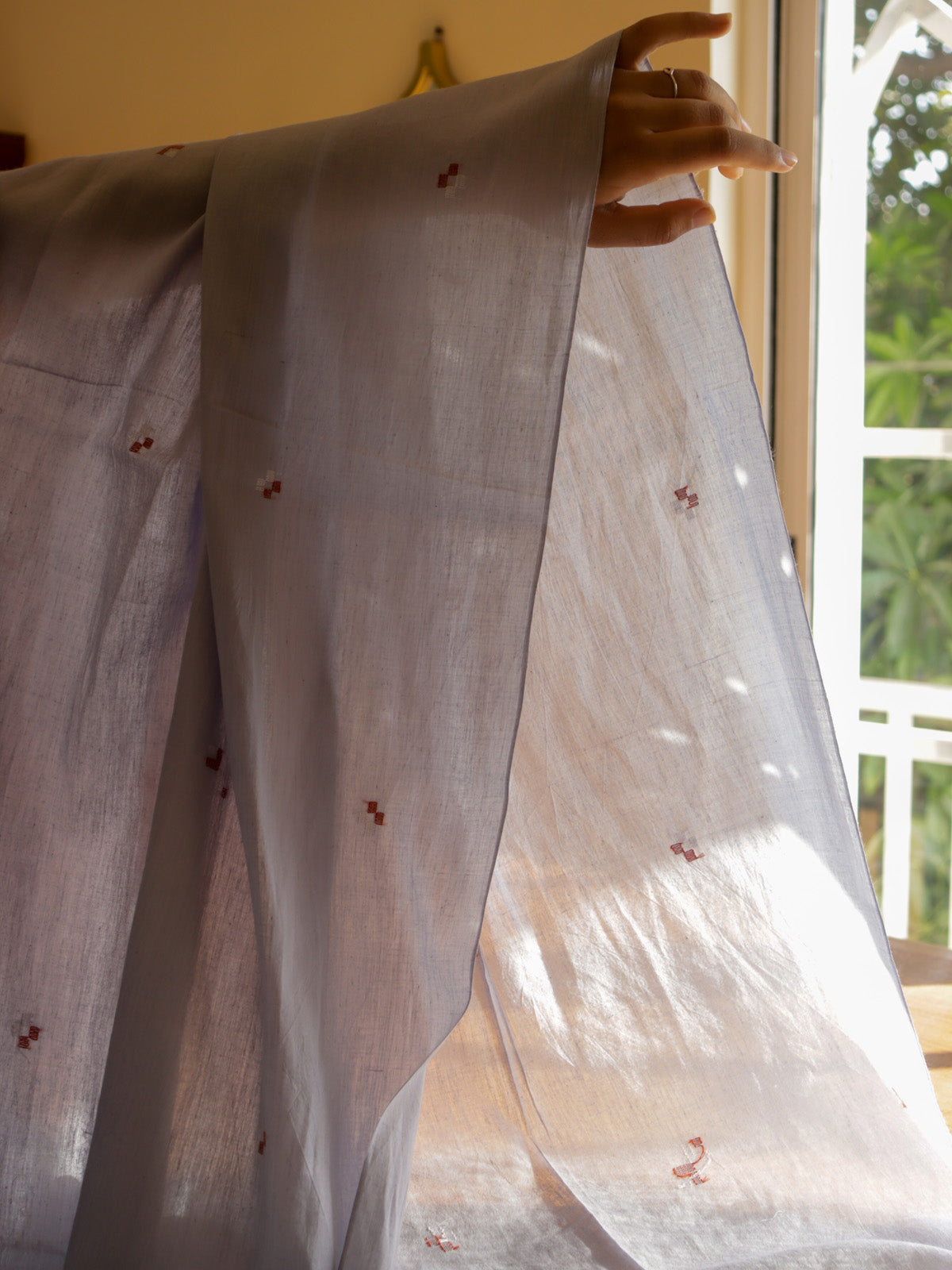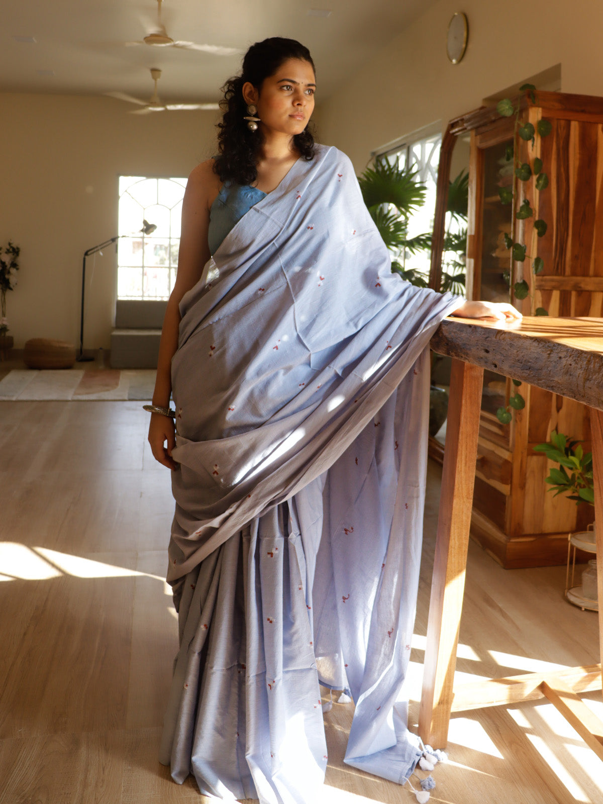 This Airy blue cotton saree is a tribute to slow, sunlit days and cool sips of comfort. Woven with dainty geometric Jamdani motifs inspired by ice cubes and chilled drinks, it blends tradition with a playful, modern charm. The soft fabric drapes effortlessly, making it perfect for breezy days and laid-back gatherings. Refreshing, subtle, and full of personality — it’s a saree that feels like summer in motion.