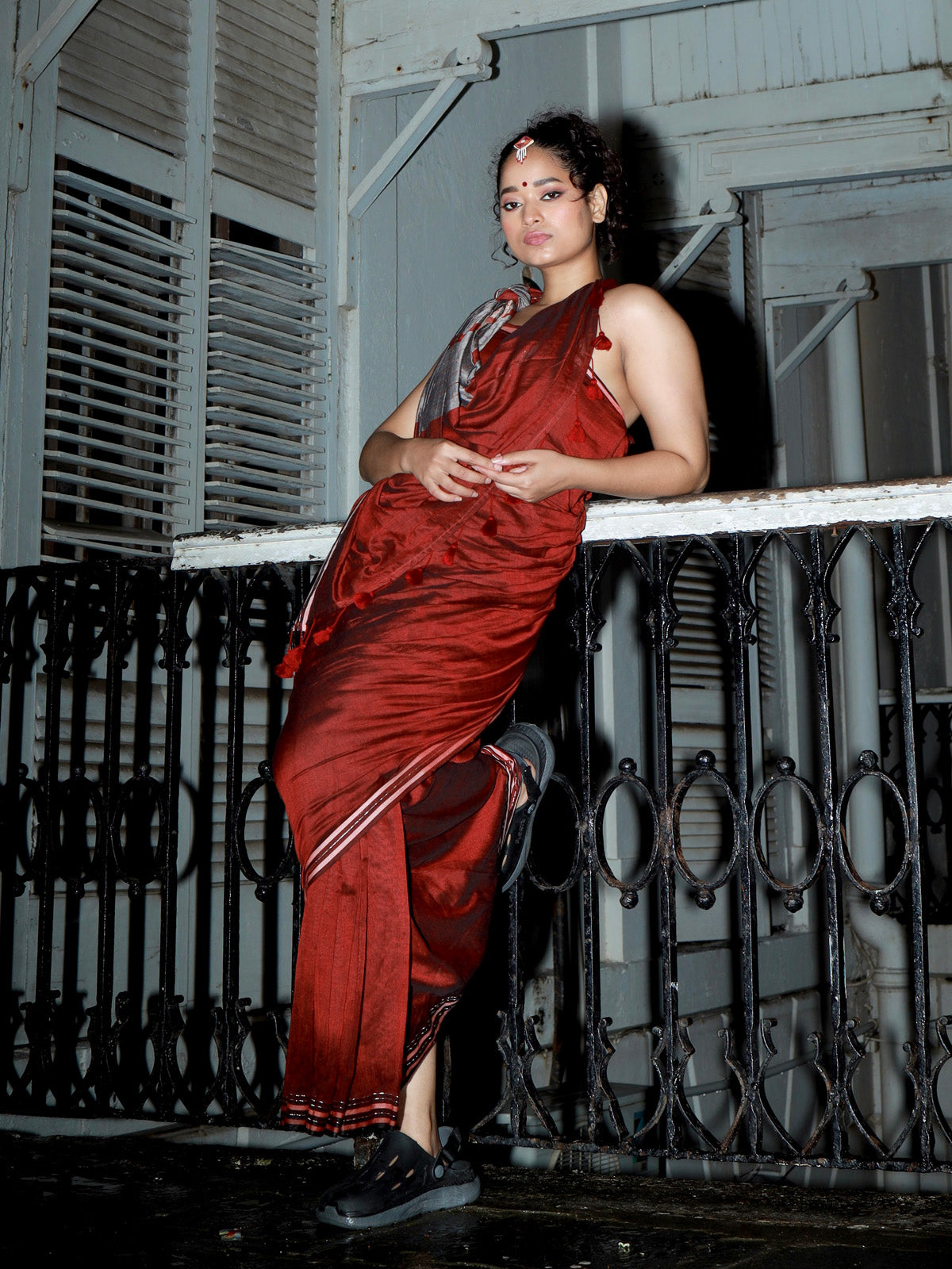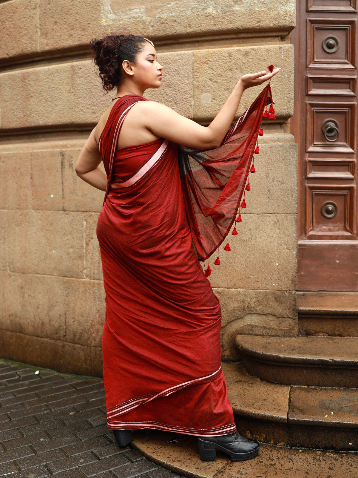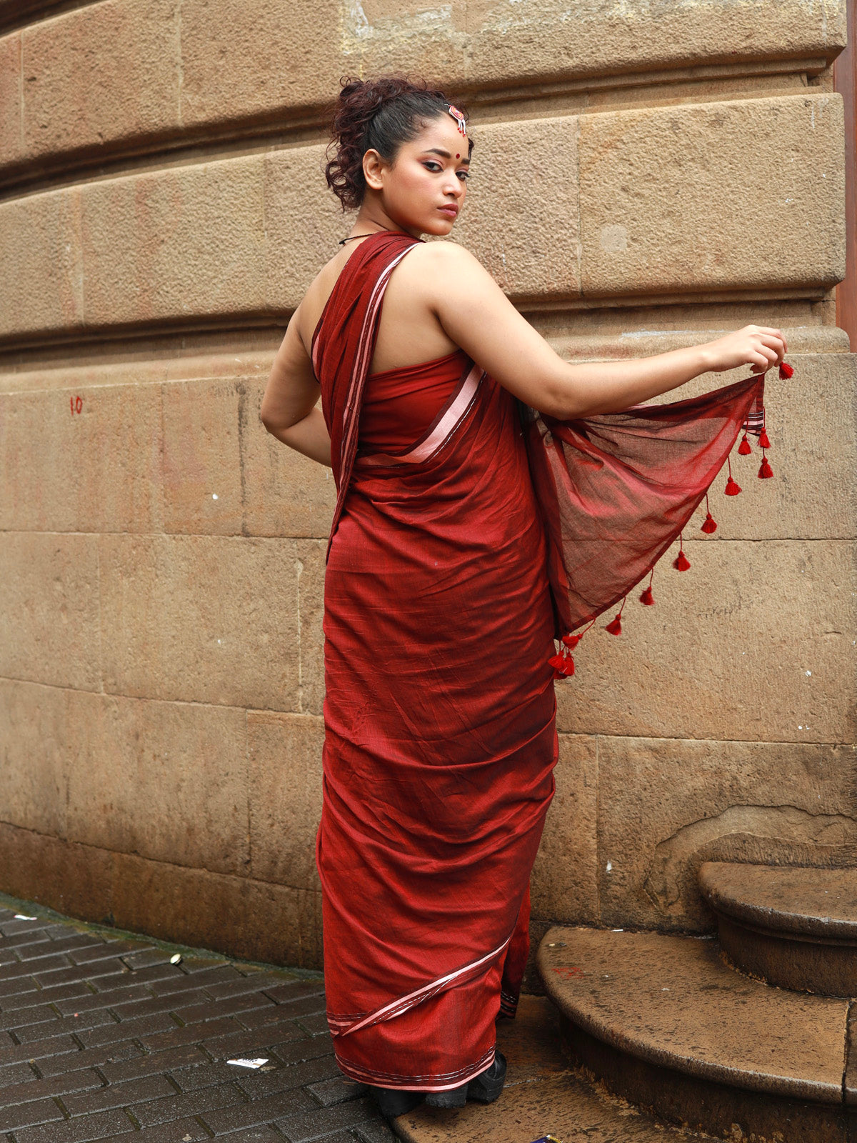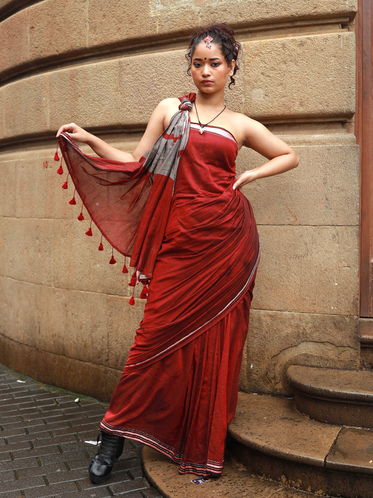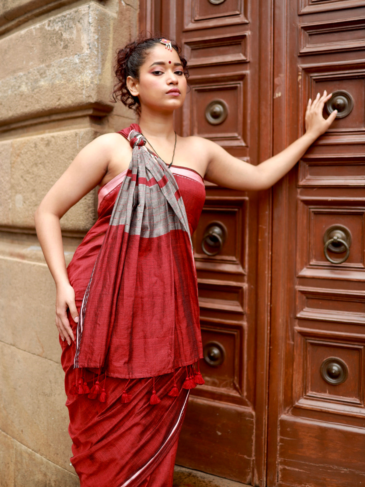 Red Cotton Saree with delicate Zari Border, Grey Pallu and Woven Sequins