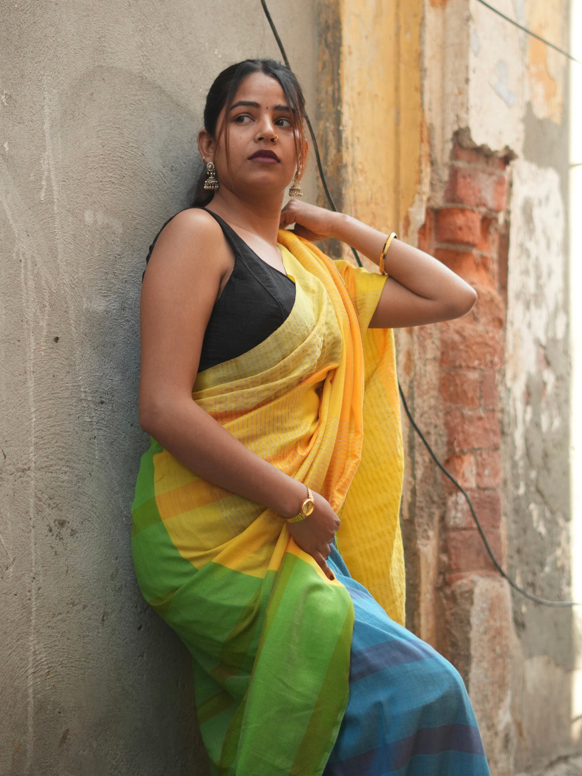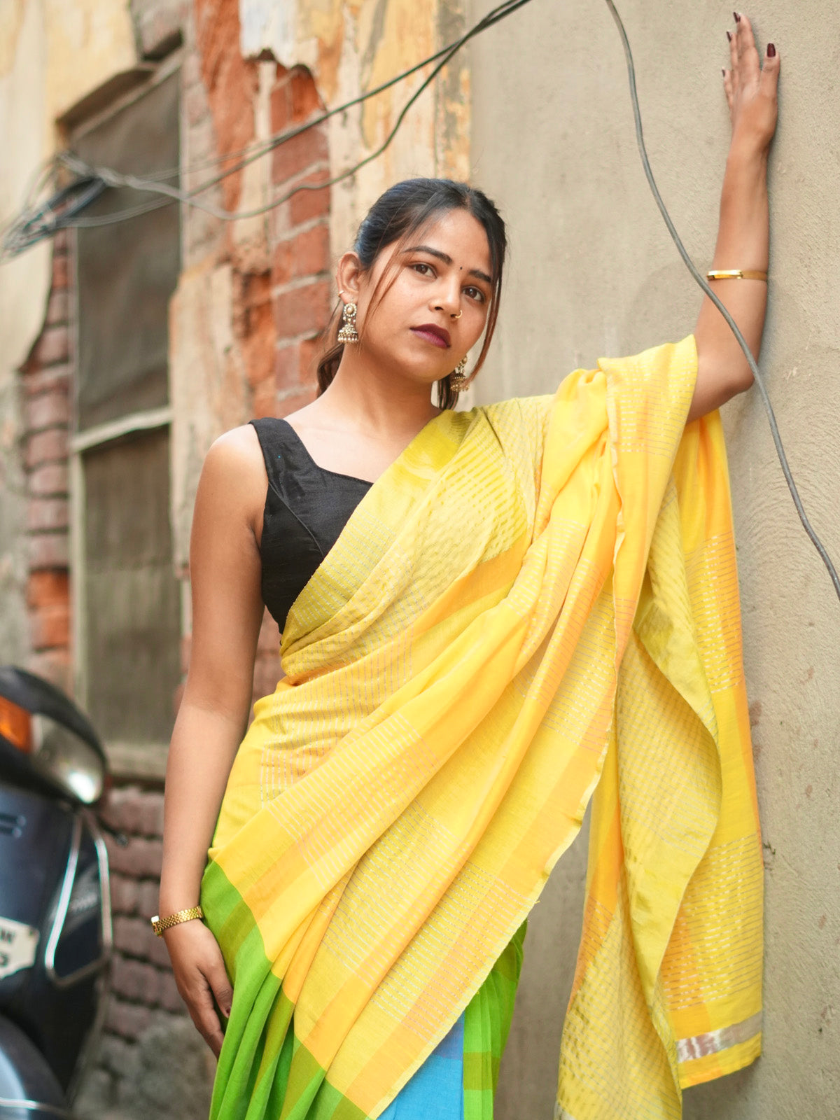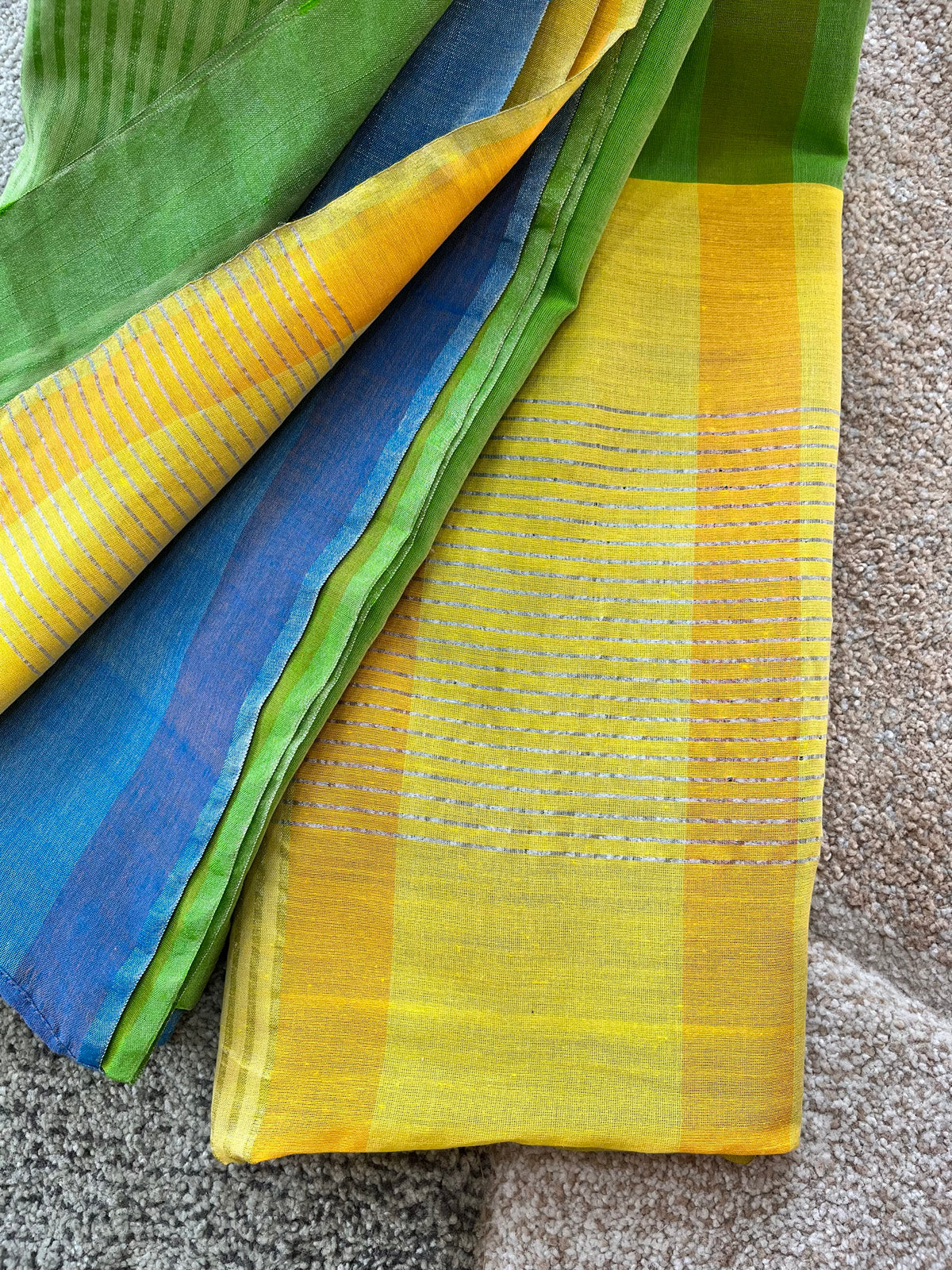 A soft tri-color Acrylic saree in Yellow, Green, and Blue.