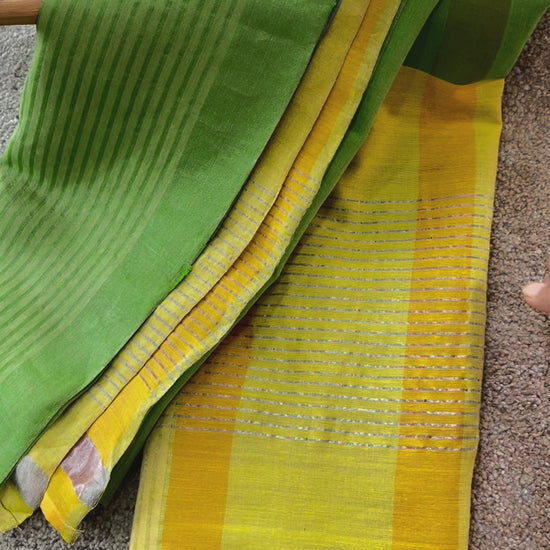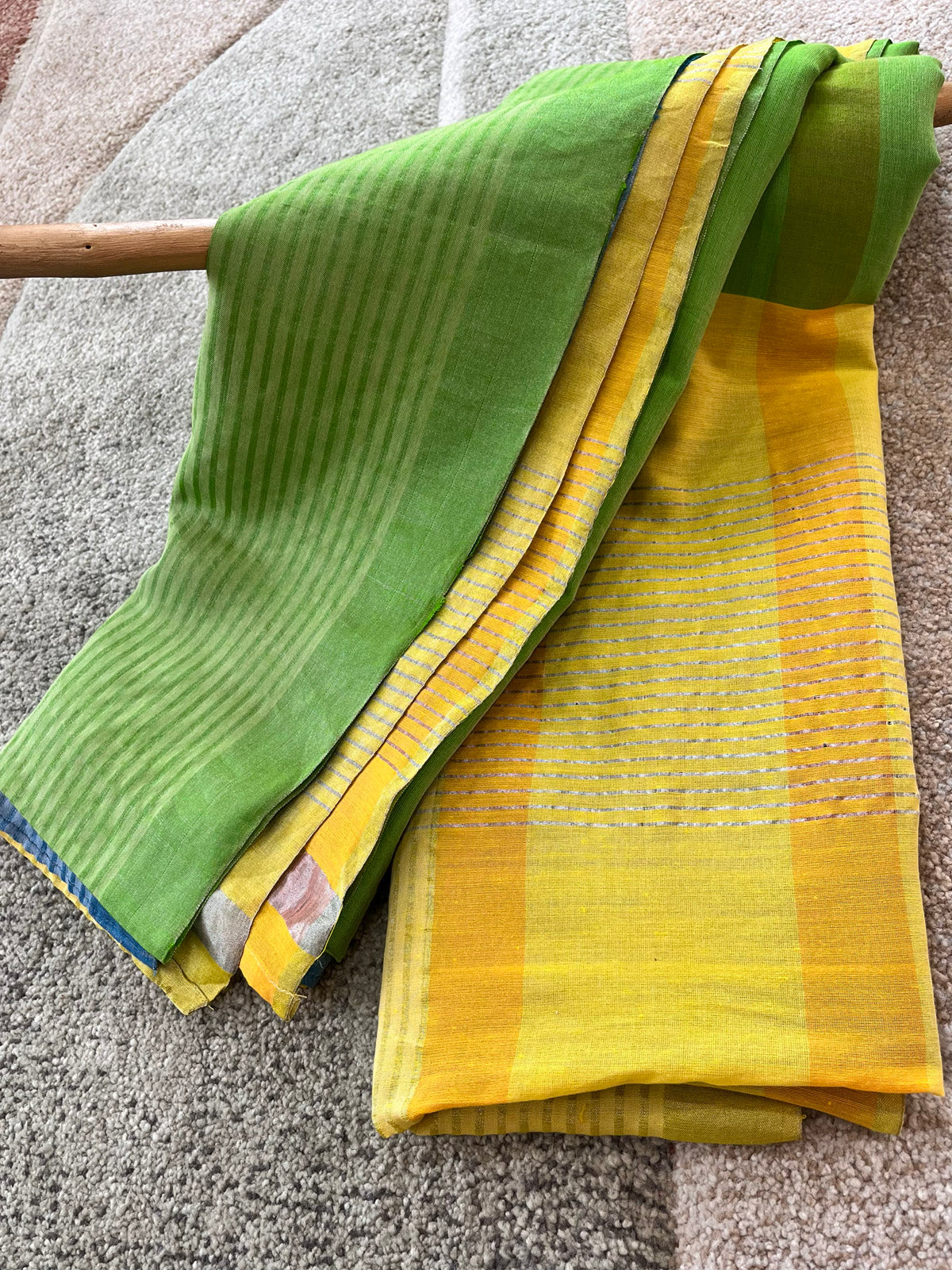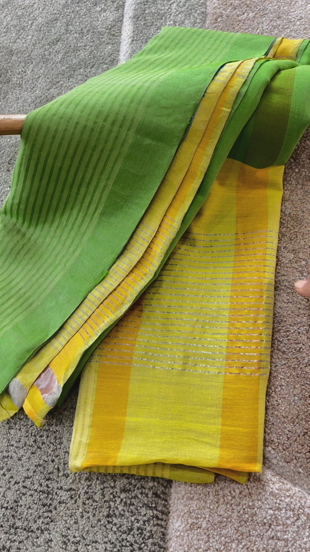 A soft tri-color Acrylic saree in Yellow, Green, and Blue.
