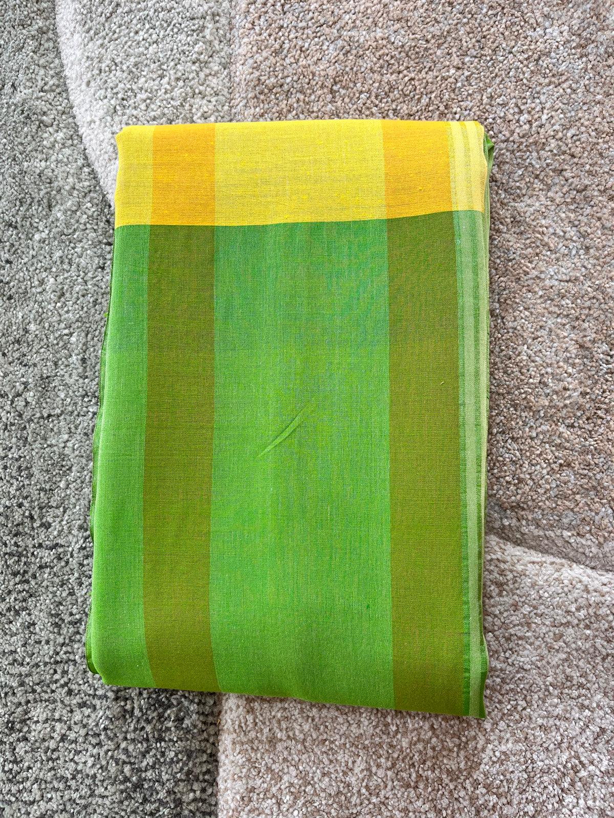 The green mul cotton saree is very soft and light on the body. It drapes so nicely and feels super comfortable. I love the colour—it’s calm and fresh. I like my sarees a bit crisp, so I added some starch, and it looked even better!