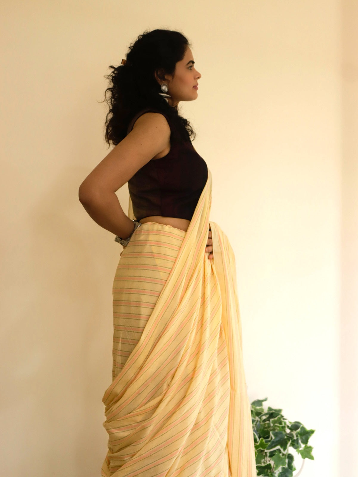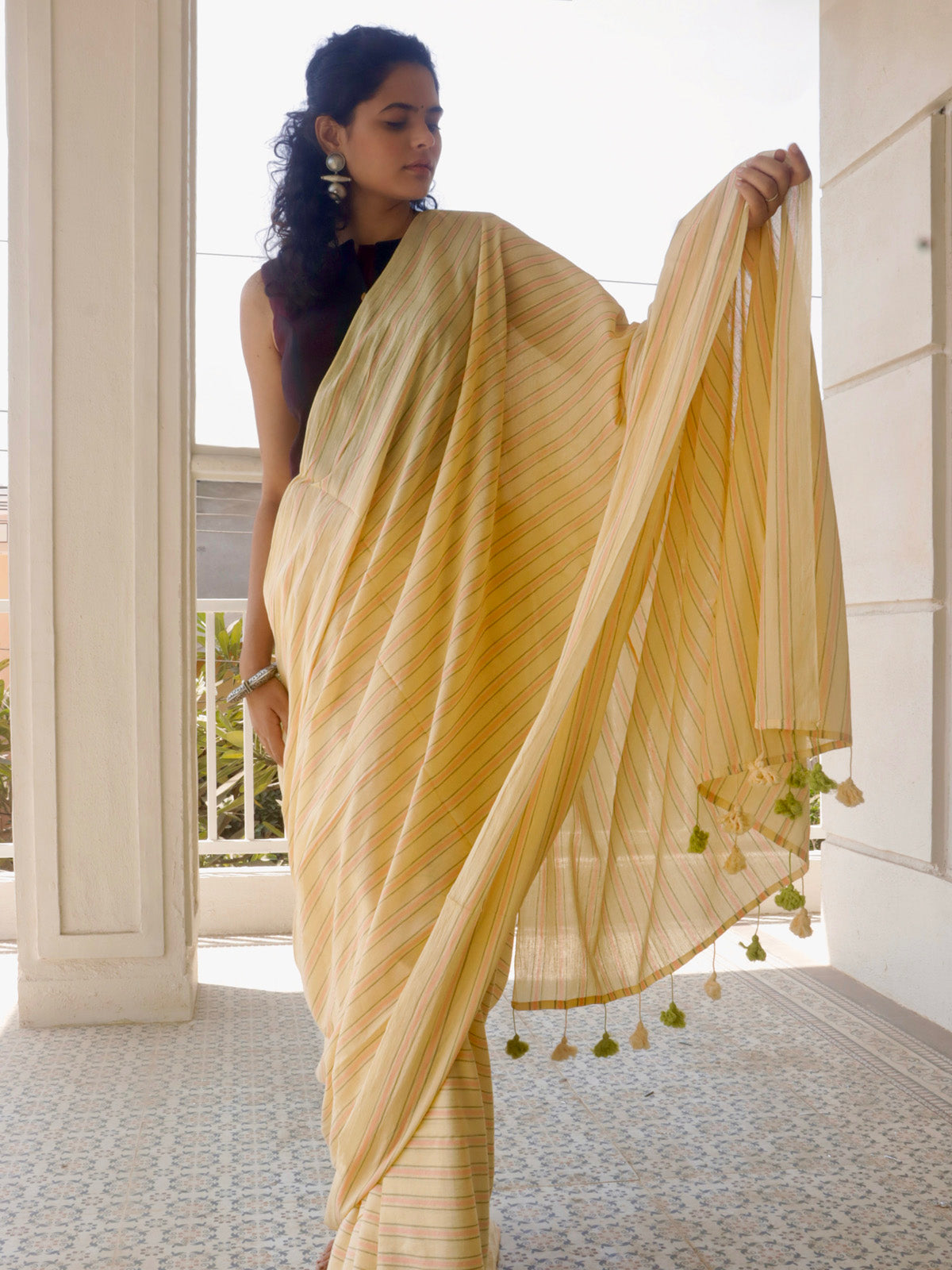 Gulbahar is a delicate dream woven in pale vintage yellow, with soft stripes that feel like morning light filtering through old lace curtains. Subtle yet soulful, this saree carries the warmth of nostalgia — of pressed flowers in books, sunlit verandas, and quiet moments. Lightweight and timeless, Gulbahar wraps you in understated grace, making every day feel like a page from a cherished memory.