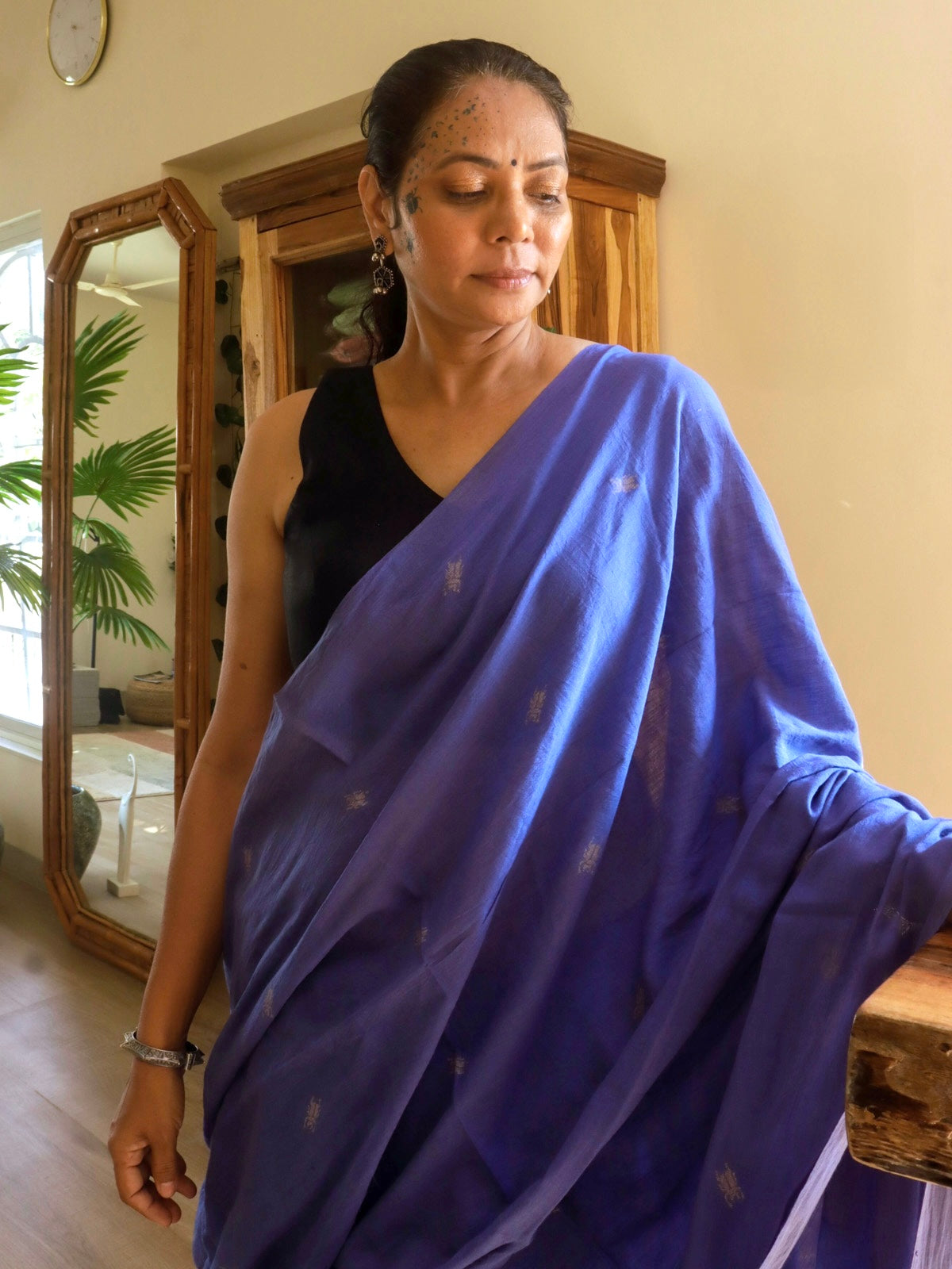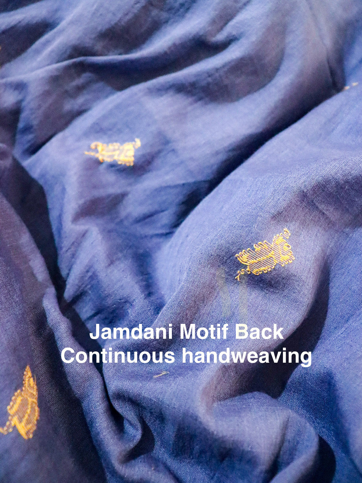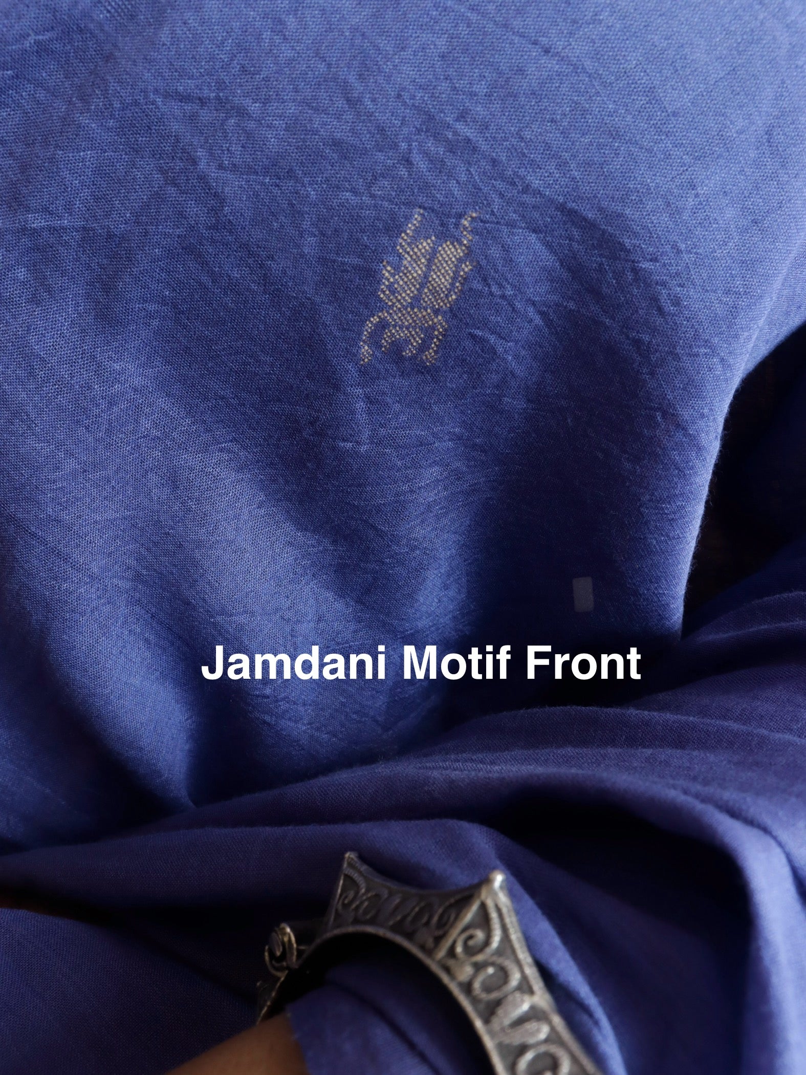 Beetle Indigo is a bold, moody saree steeped in the quiet drama of deep twilight. Handwoven in rich indigo with intricate Jamdani motifs inspired by the iridescent glint of beetle wings, it strikes a balance between mystery and elegance. The motifs shimmer subtly as the light catches them, adding depth and texture to the drape. Perfect for evening soirees or days when you want your presence to linger — dark, distinctive, and full of character.