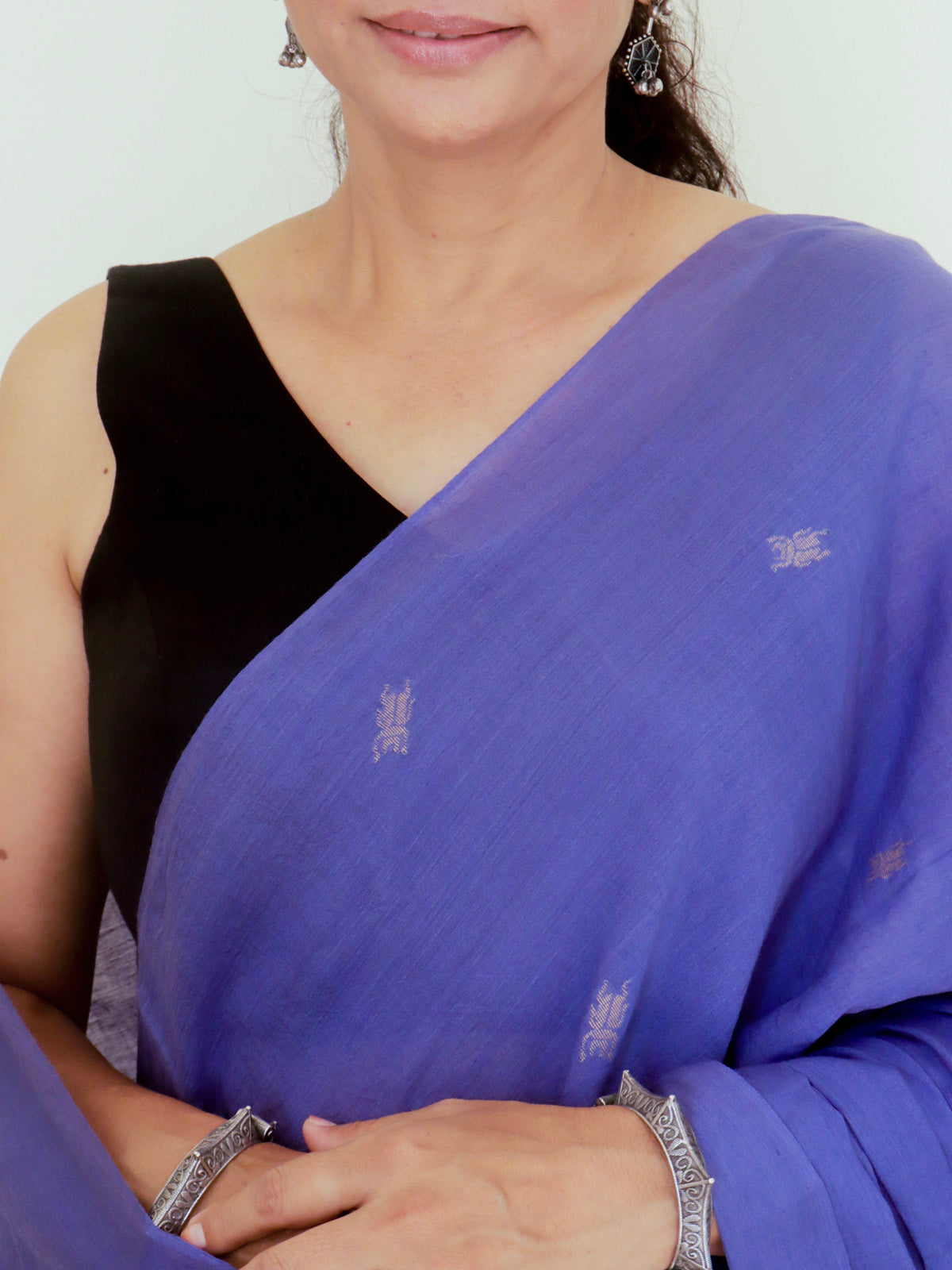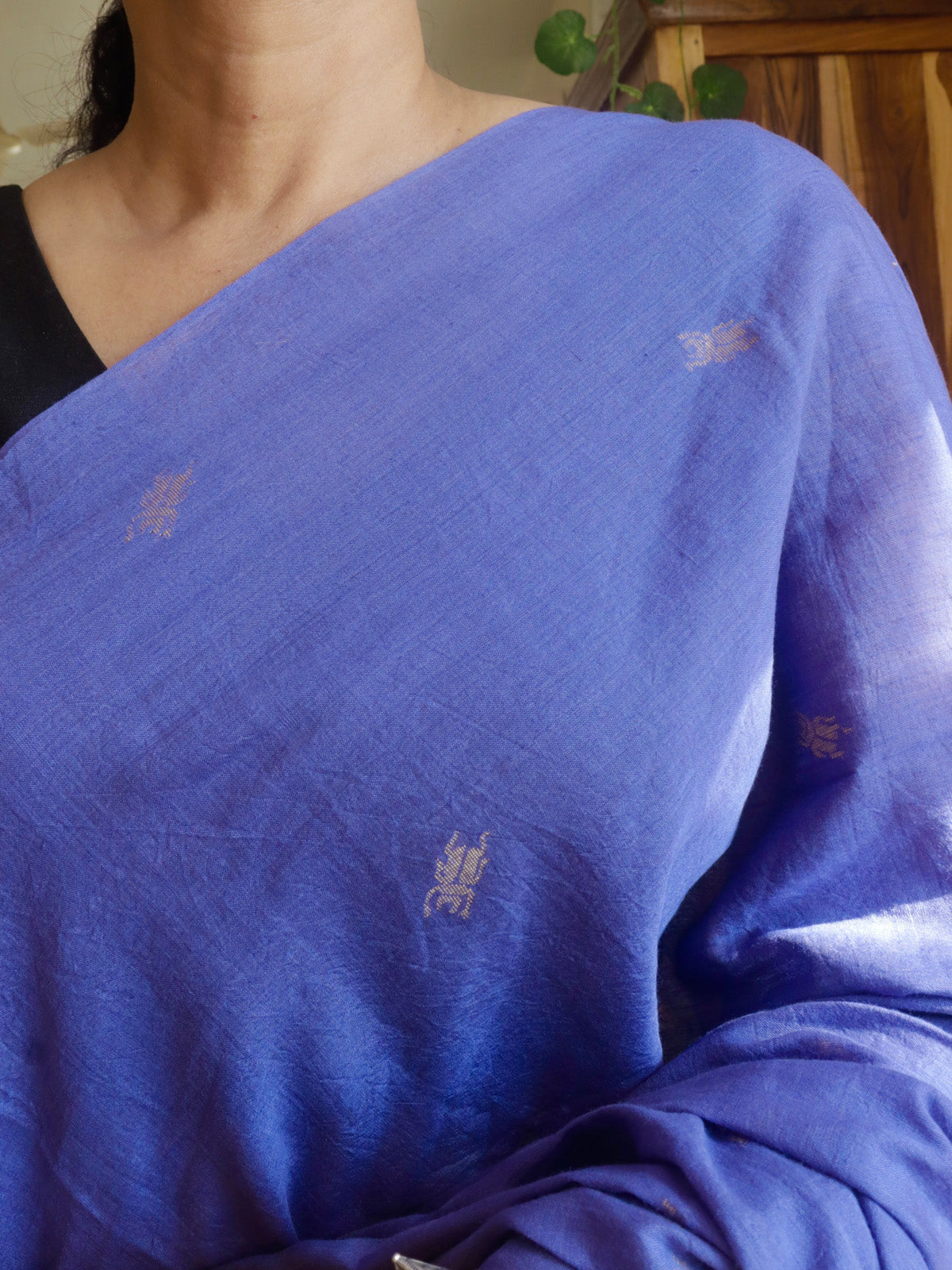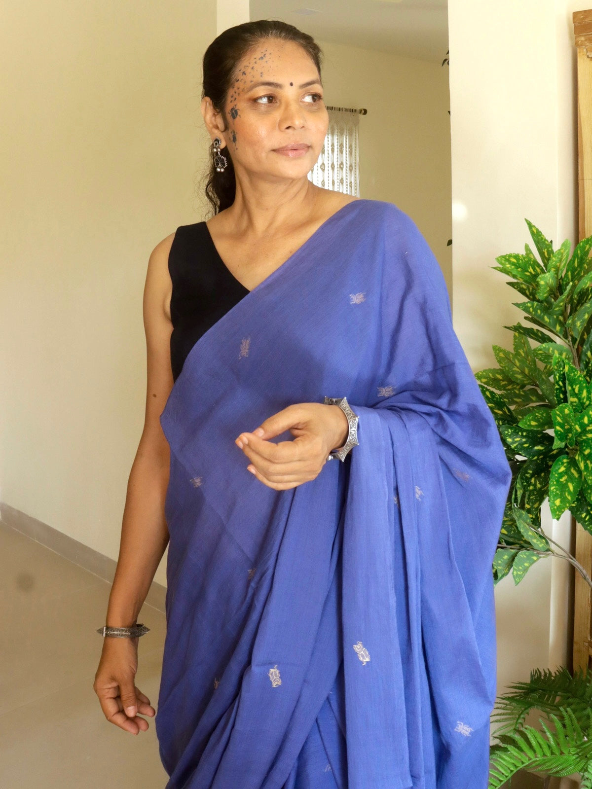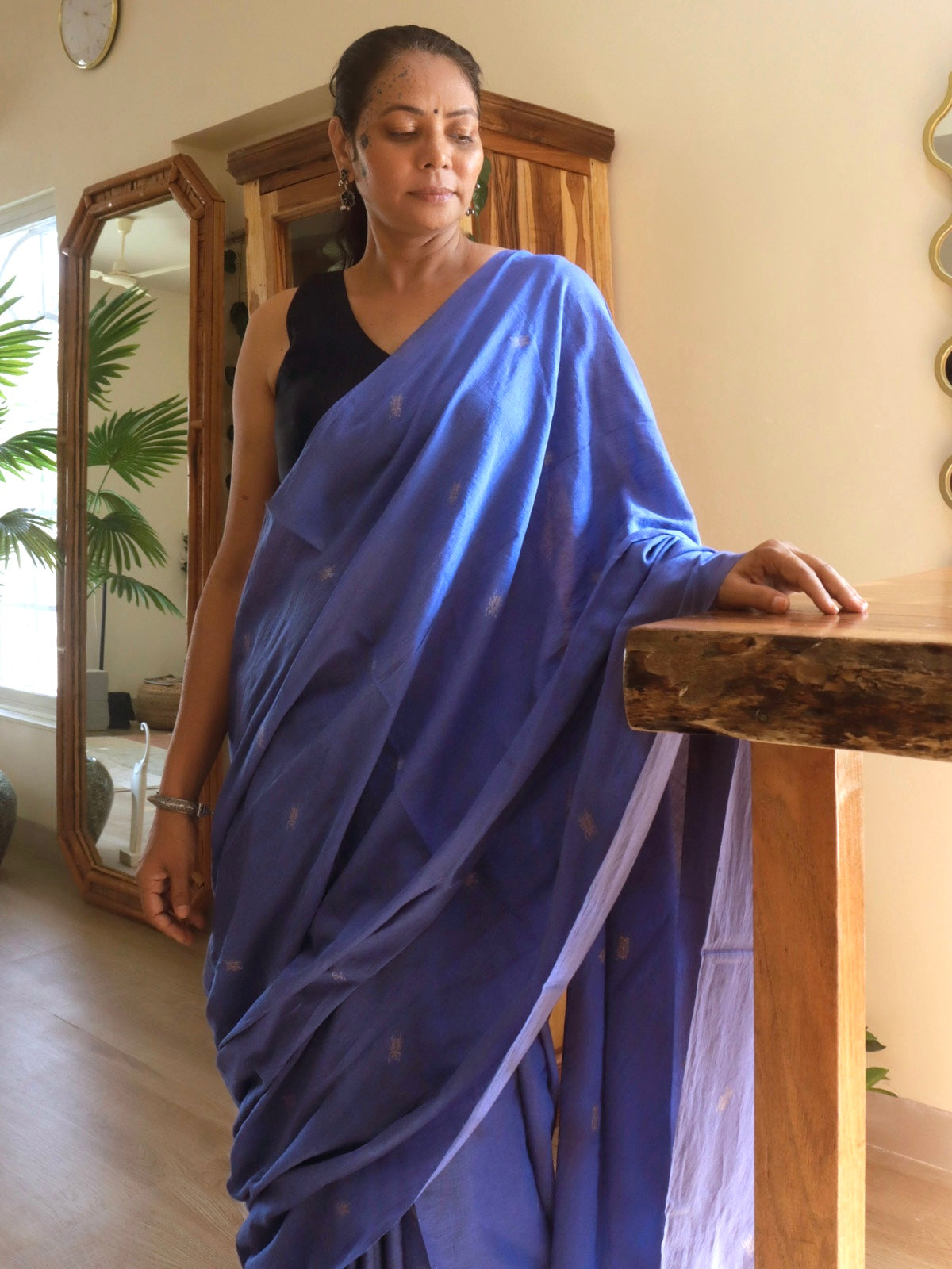 Beetle Indigo is a bold, moody saree steeped in the quiet drama of deep twilight. Handwoven in rich indigo with intricate Jamdani motifs inspired by the iridescent glint of beetle wings, it strikes a balance between mystery and elegance. The motifs shimmer subtly as the light catches them, adding depth and texture to the drape. Perfect for evening soirees or days when you want your presence to linger — dark, distinctive, and full of character.