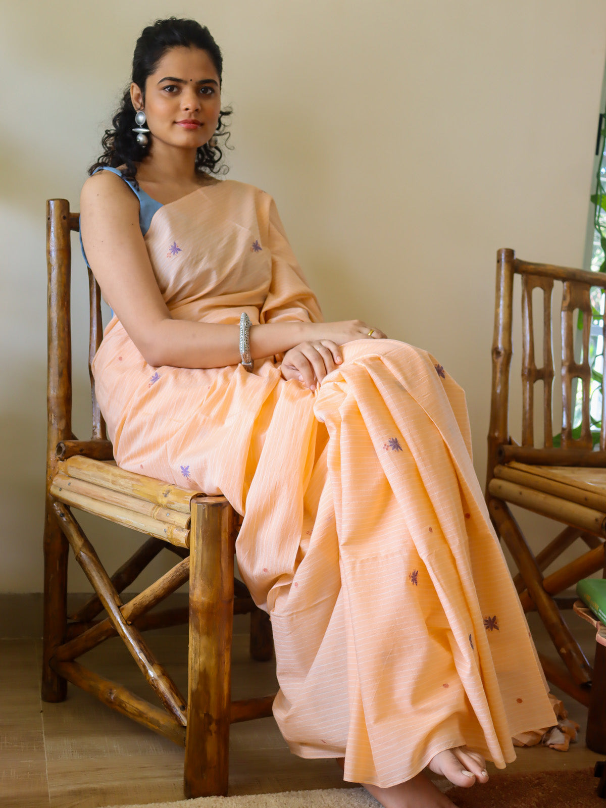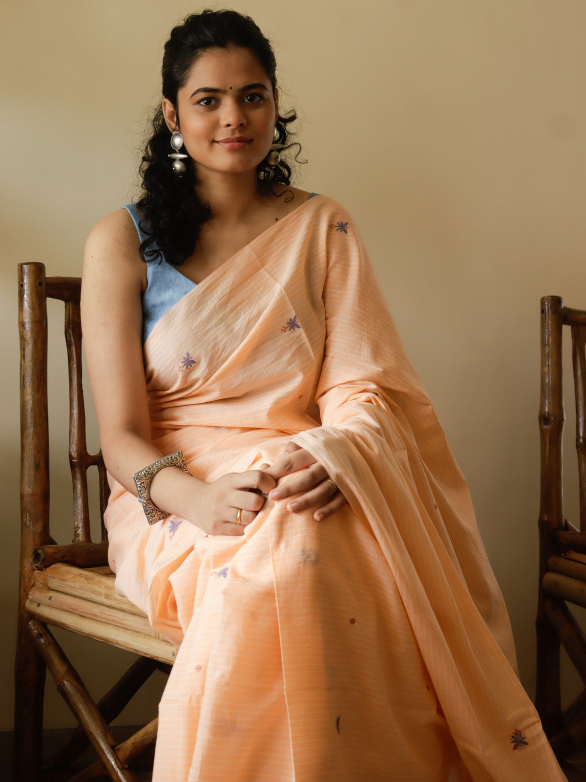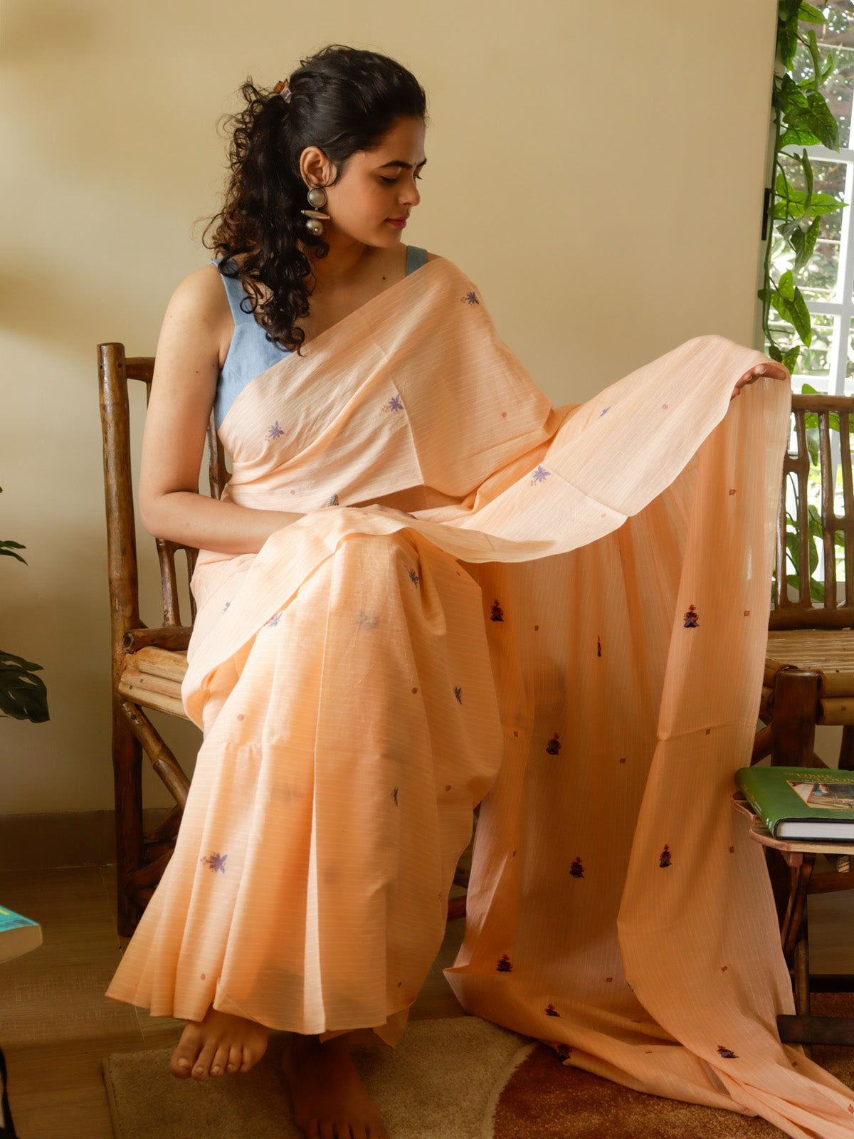 Like a soft summer hush, this Peach Lantana saree blooms with quiet beauty. Woven in a soothing peach hue, it features delicate Jamdani floral motifs inspired by the lantana flower — wild, charming, and full of grace. The fabric feels light against the skin, while the handwoven florals add a touch of poetic nostalgia. Perfect for sunlit mornings or slow, breezy evenings, this saree is an ode to nature’s gentle rhythm.