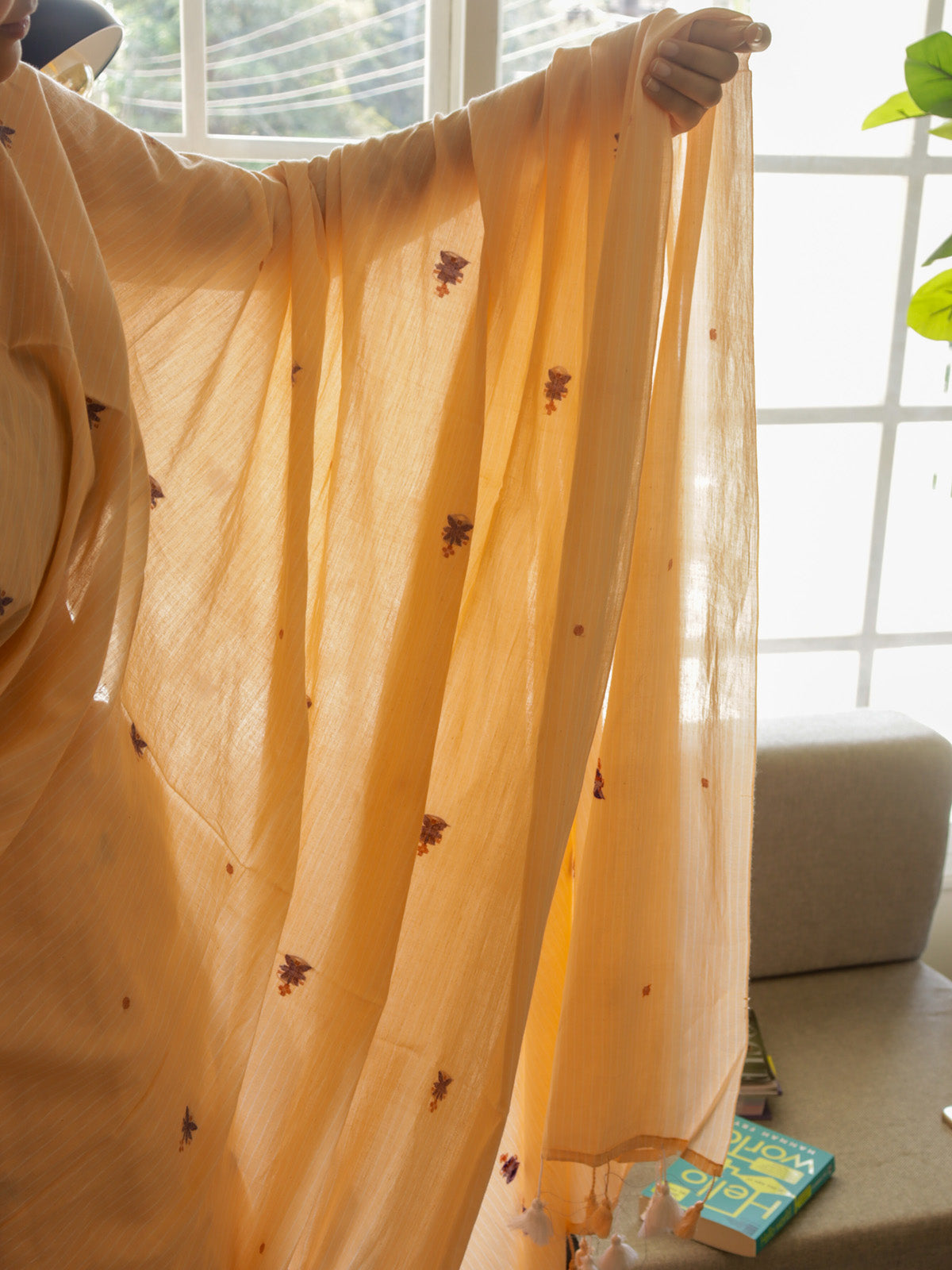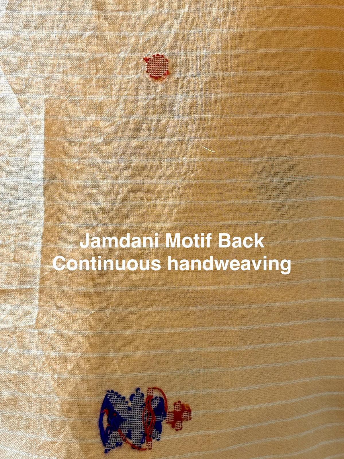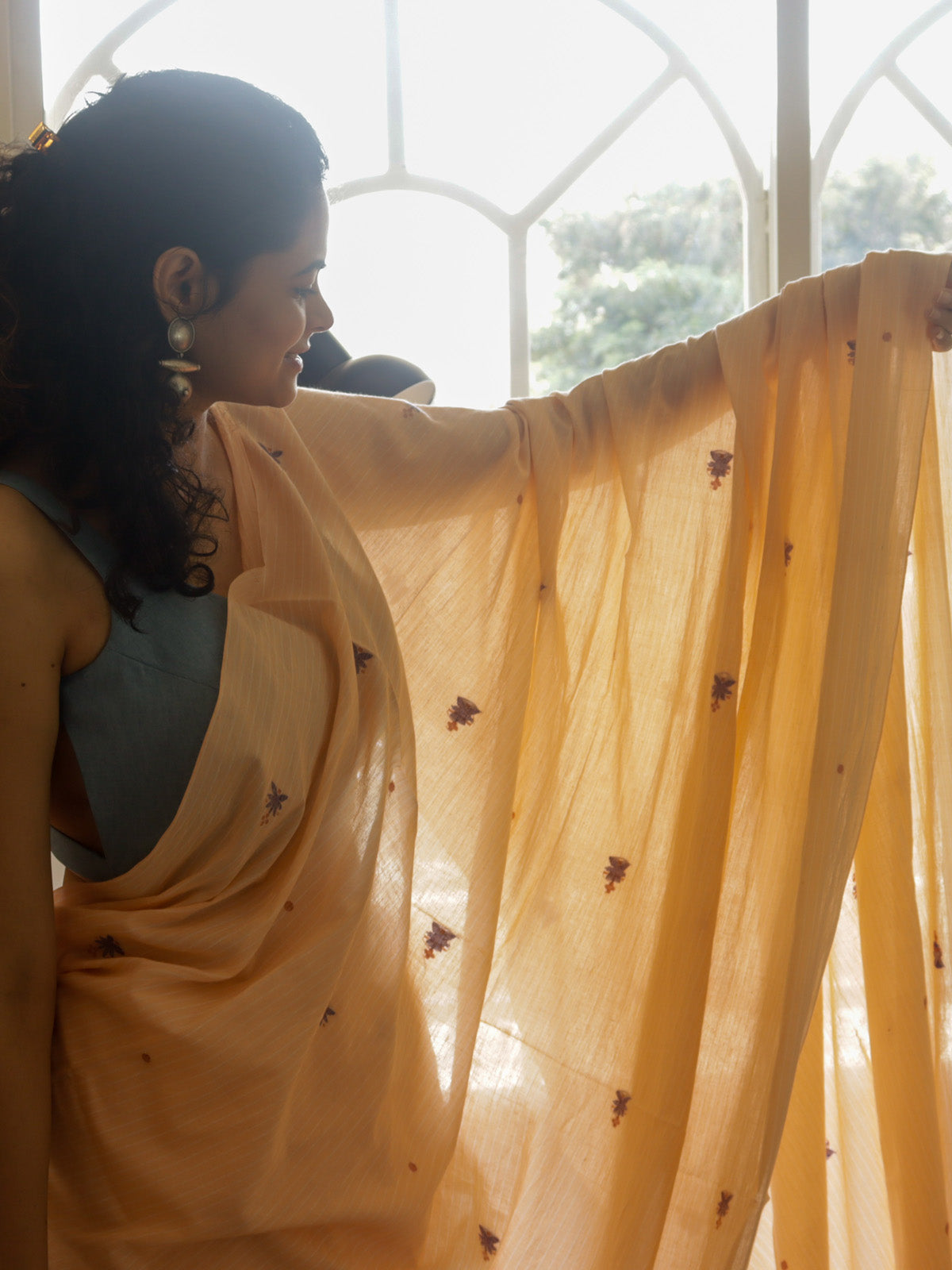 Like a soft summer hush, this Peach Lantana saree blooms with quiet beauty. Woven in a soothing peach hue, it features delicate Jamdani floral motifs inspired by the lantana flower — wild, charming, and full of grace. The fabric feels light against the skin, while the handwoven florals add a touch of poetic nostalgia. Perfect for sunlit mornings or slow, breezy evenings, this saree is an ode to nature’s gentle rhythm.