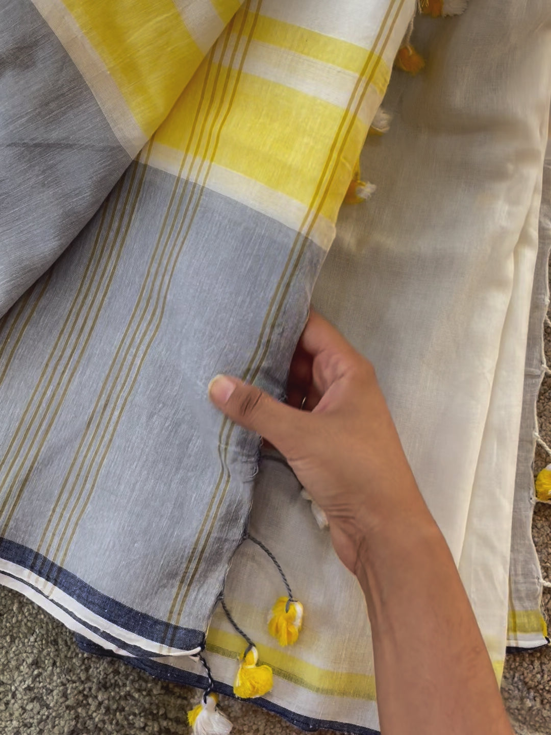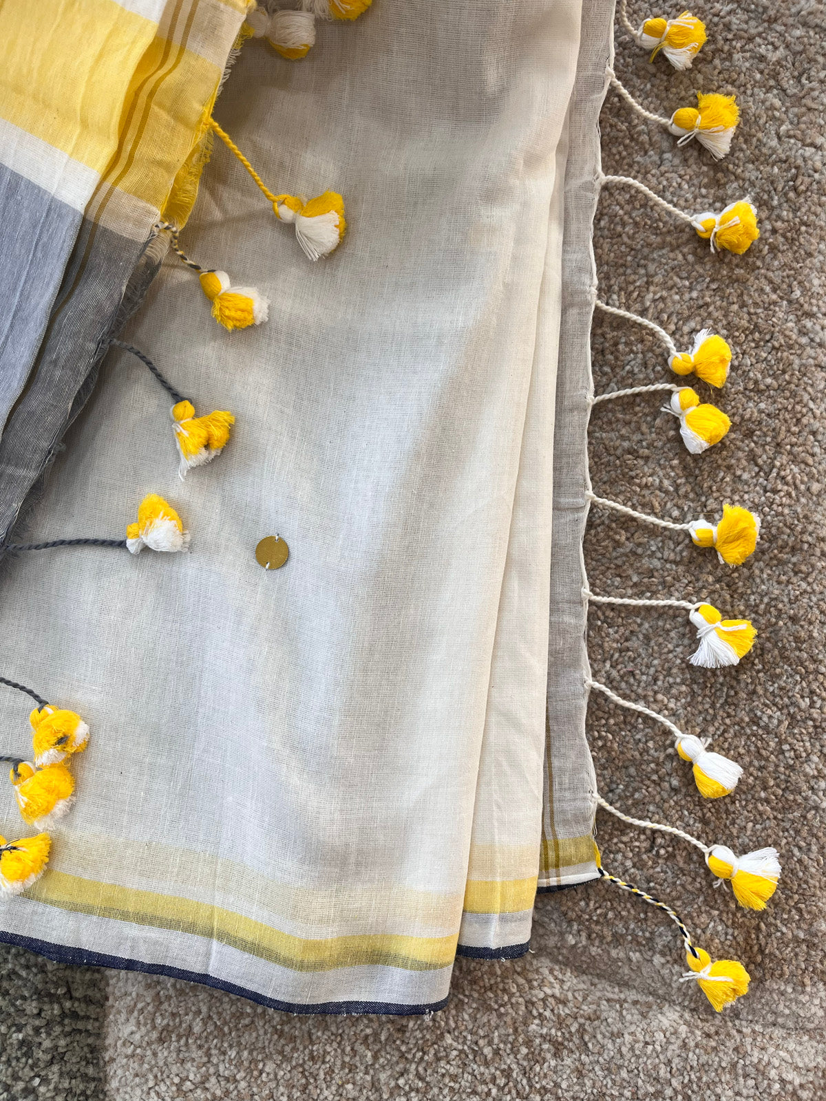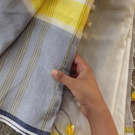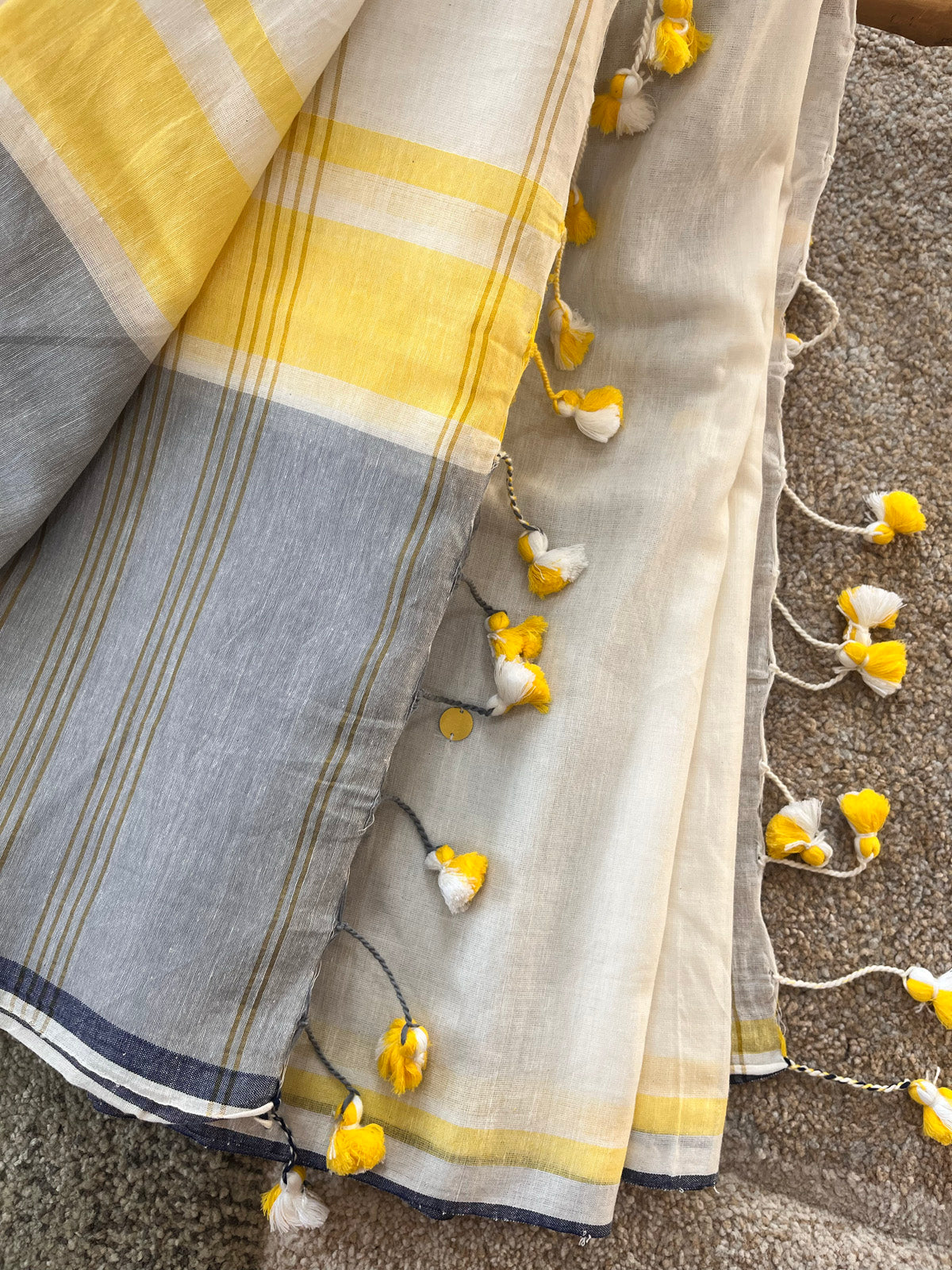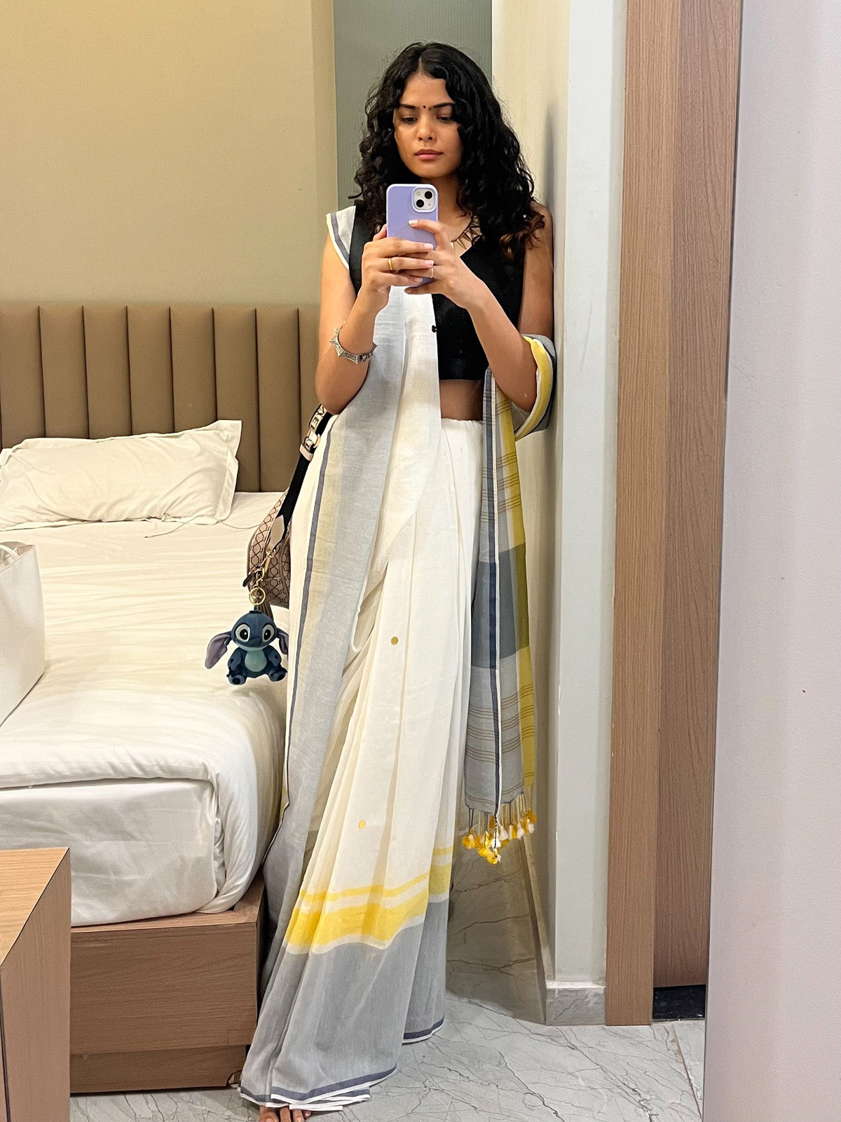 Pure Handwoven Cotton Saree in White, Gracefully Accented with Grey and Yellow Hues