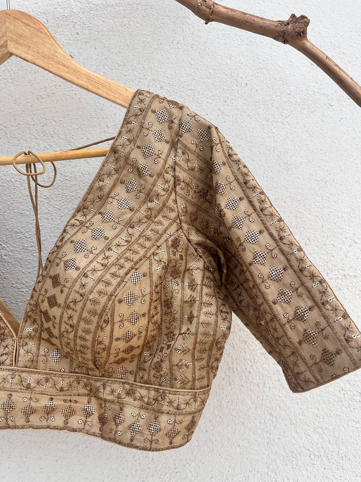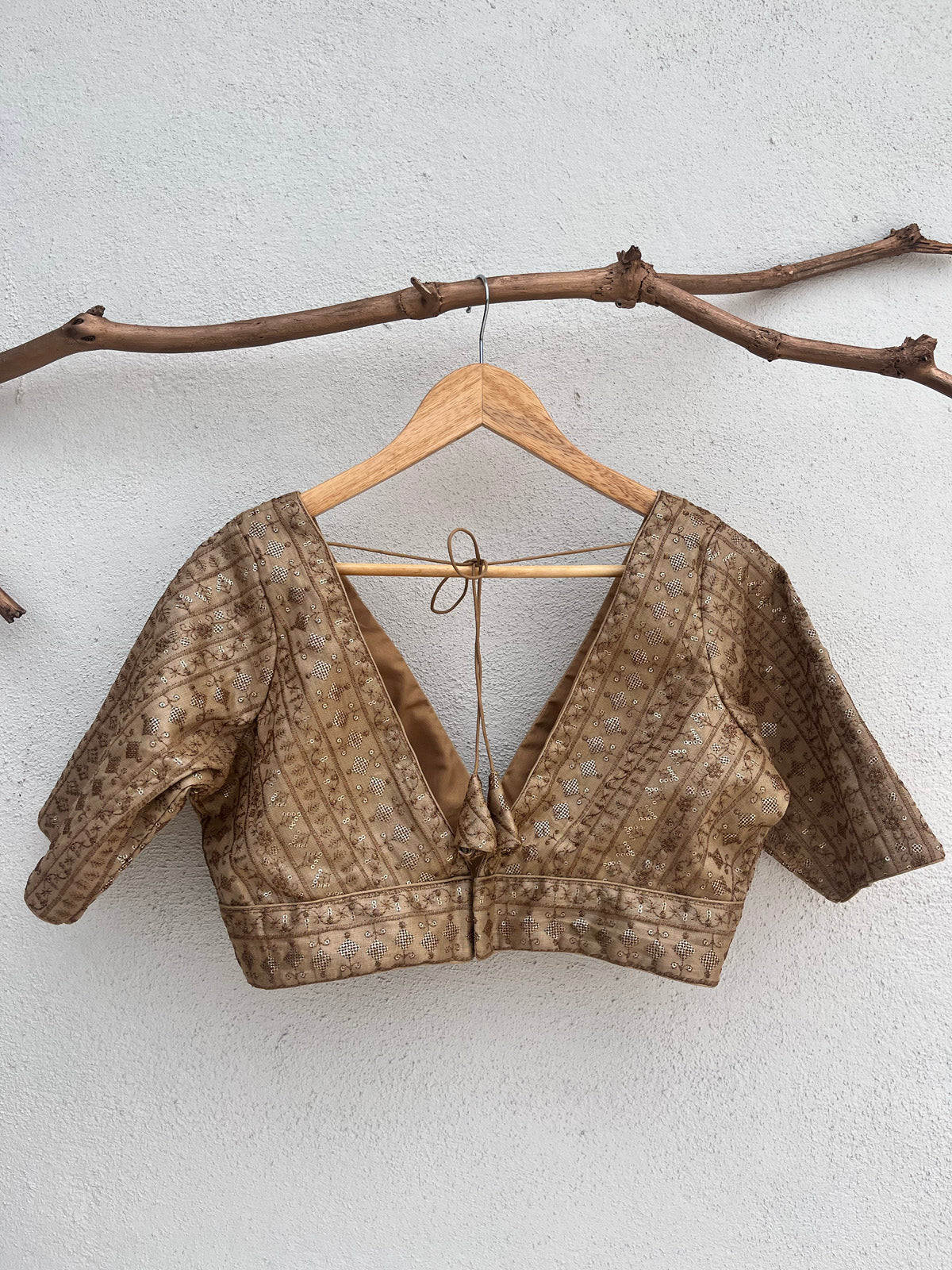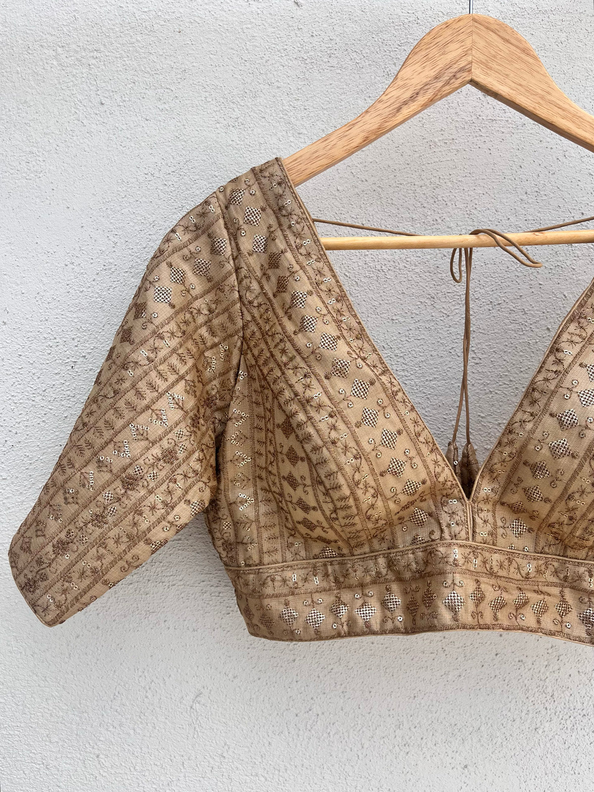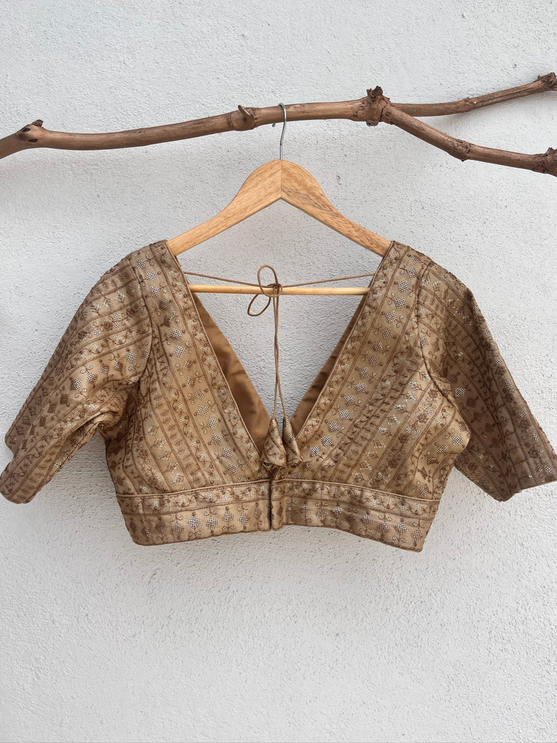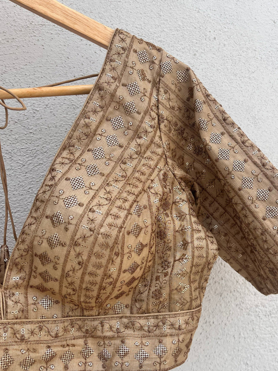 Turn heads with this sophisticated beige silk blouse, intricately embellished with sequins and embroidery in delicate geometric patterns. The plunging V-neckline adds a bold yet elegant touch, making it the perfect pick for glamorous saree ensembles.