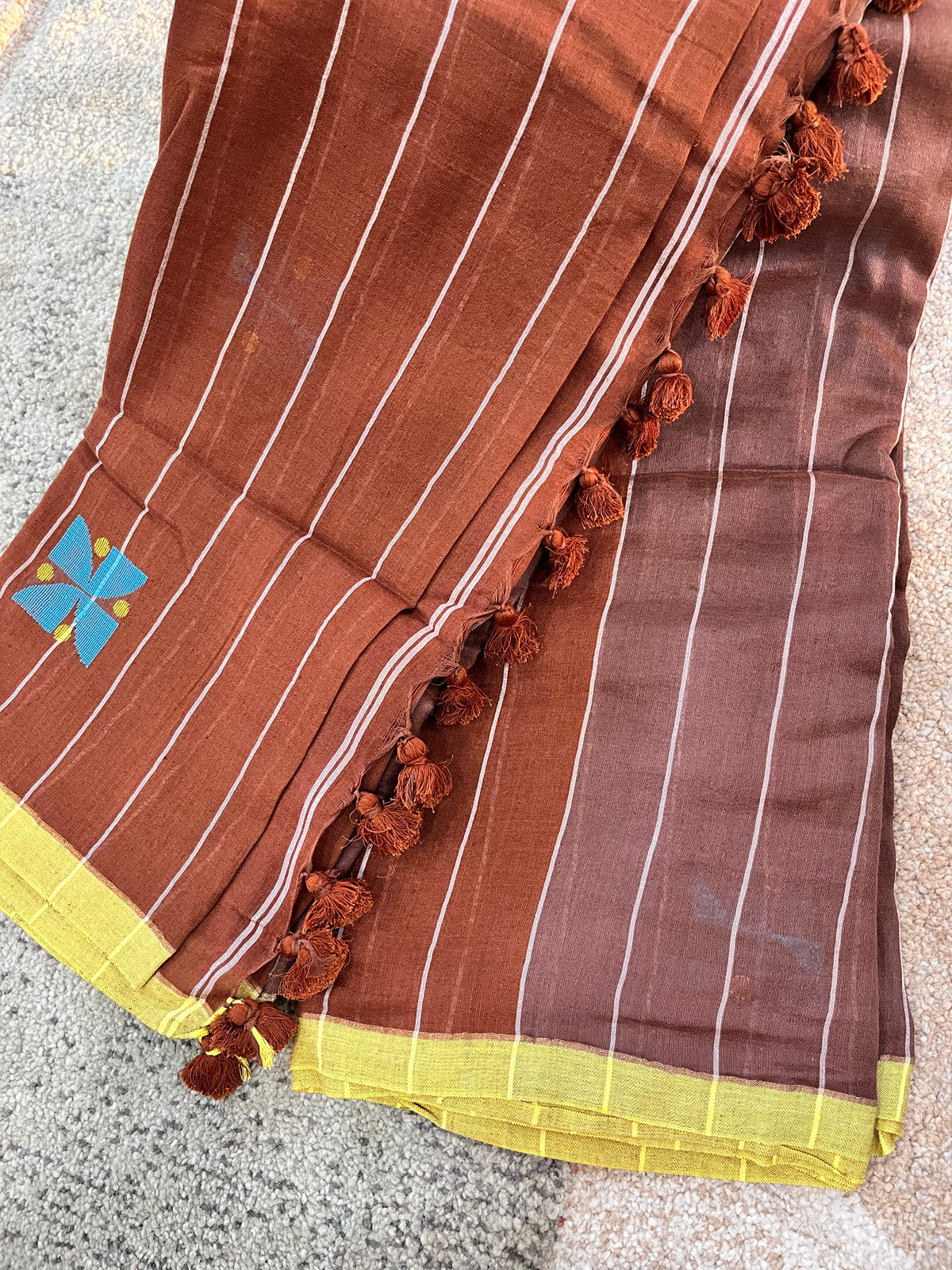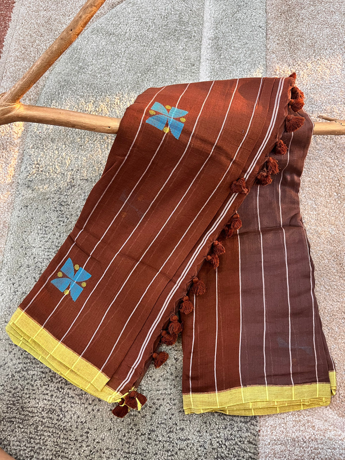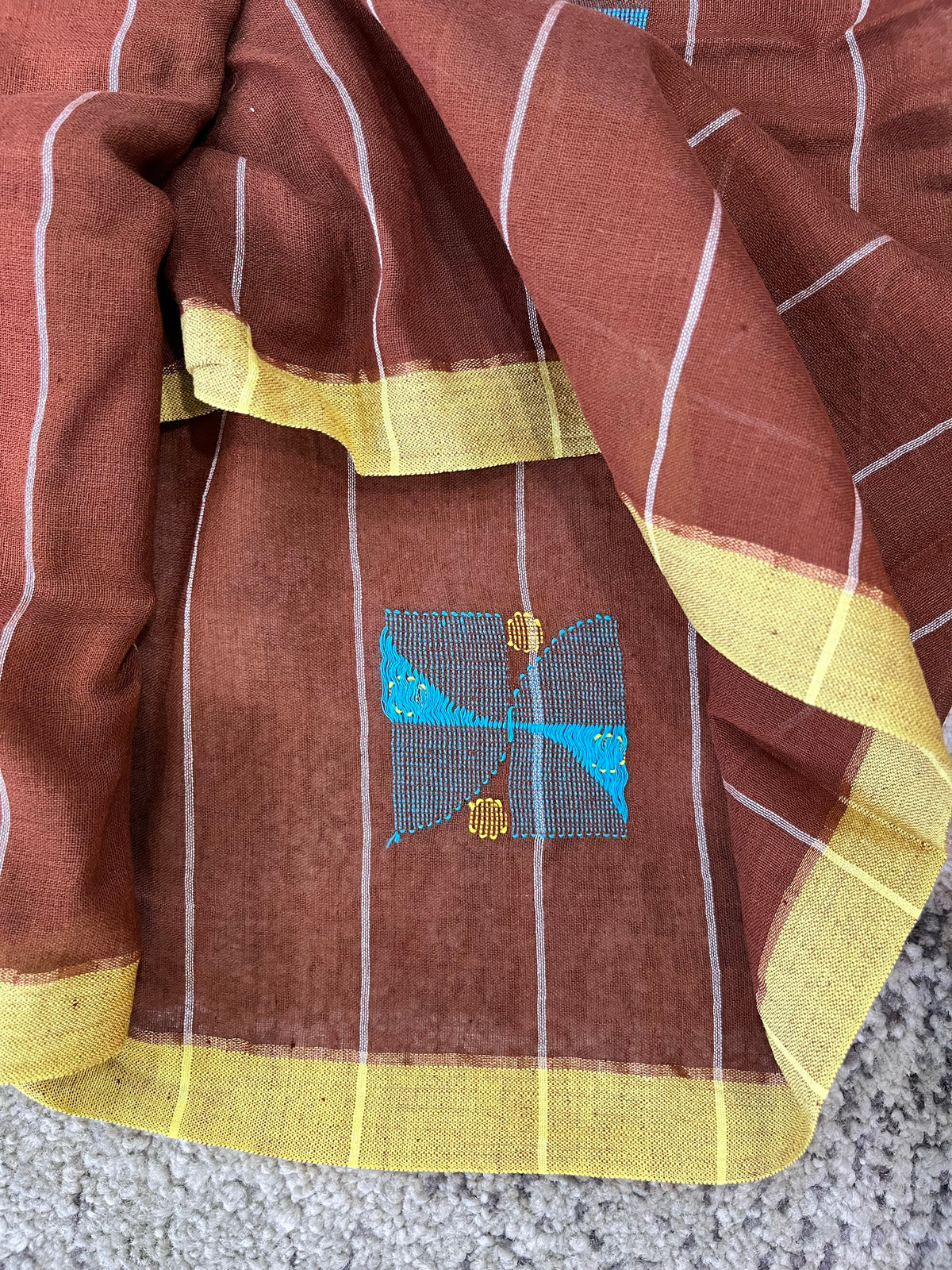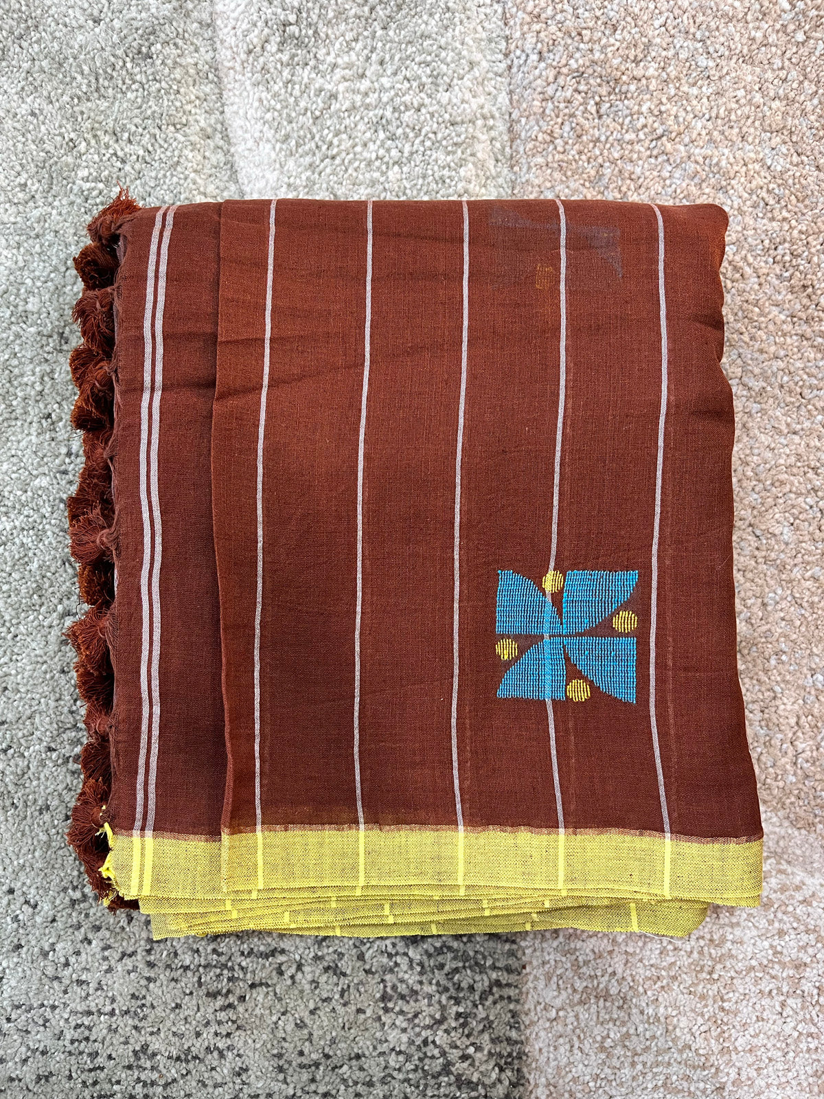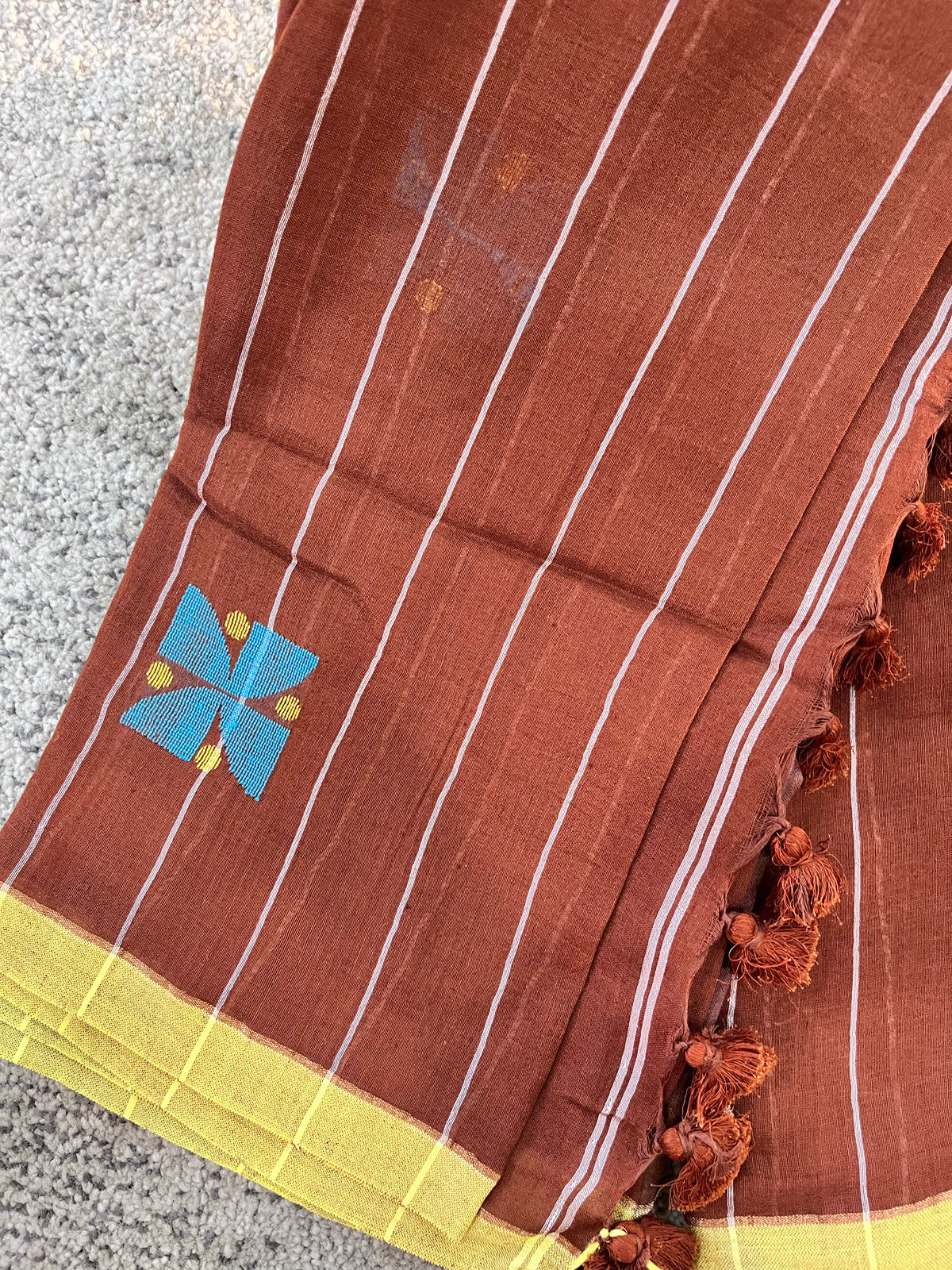 Woven in pure handspun cotton by Bengal’s expert artisans, this saree brings comfort without compromise. It’s light, breathable, and effortlessly fits into everything from coffee plans to celebration days.
