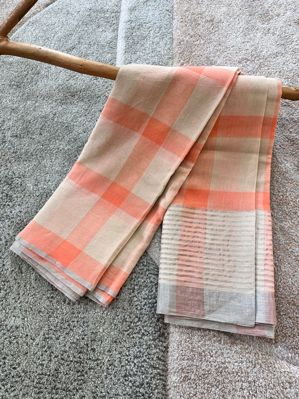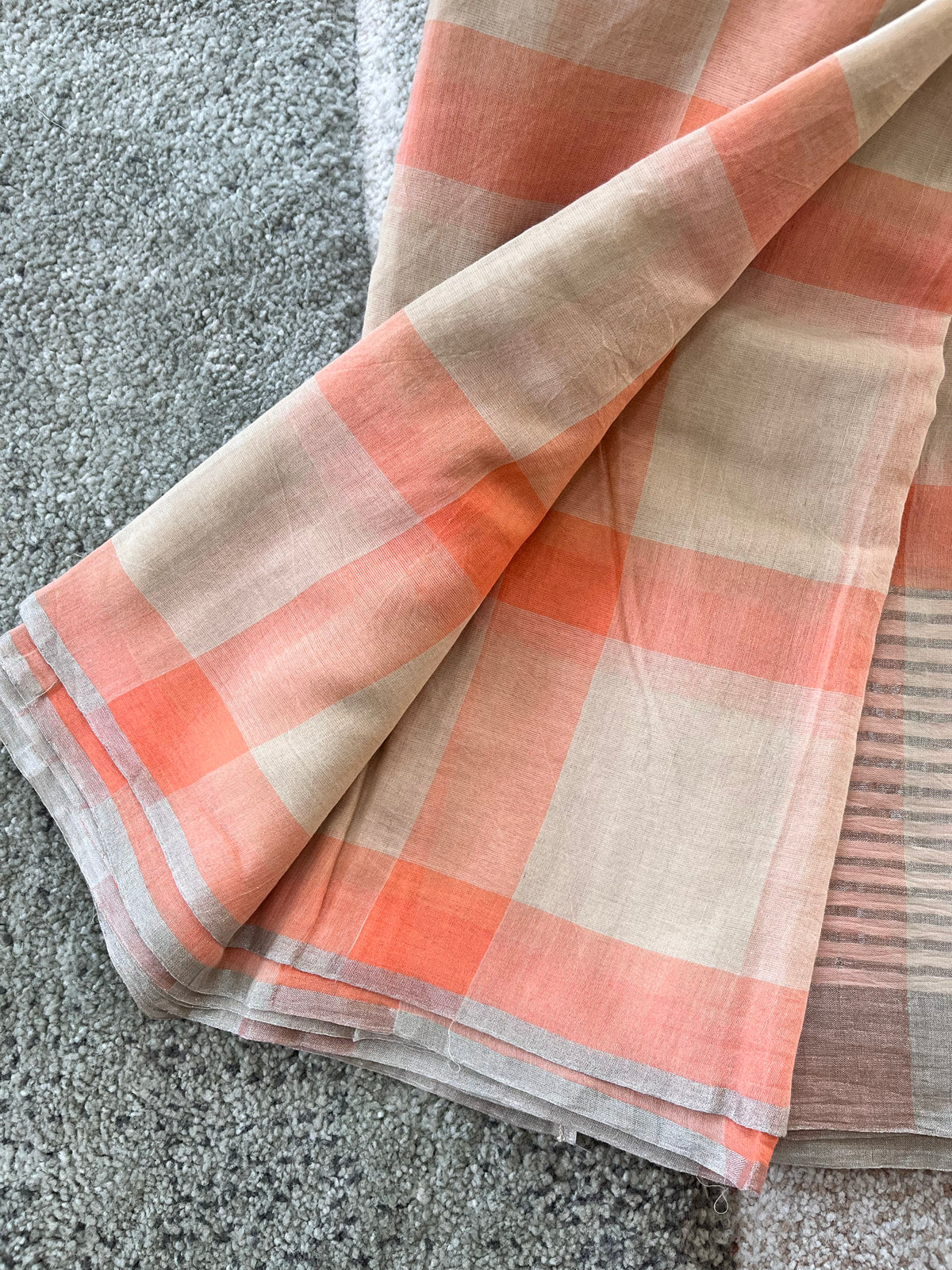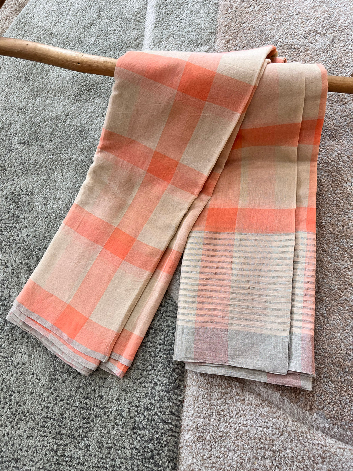 Handwoven Cotton Extrasoft saree in peach color with checks
