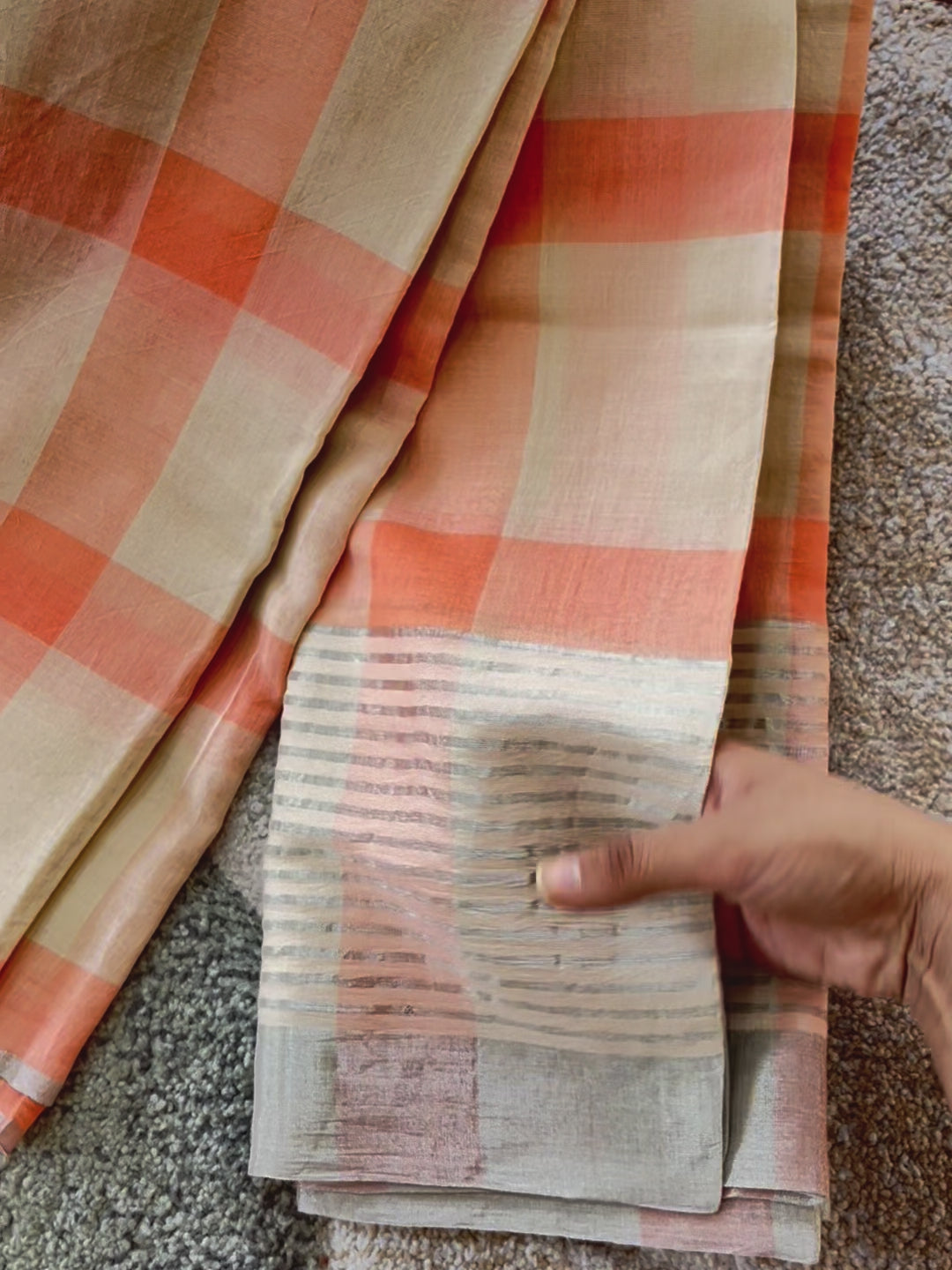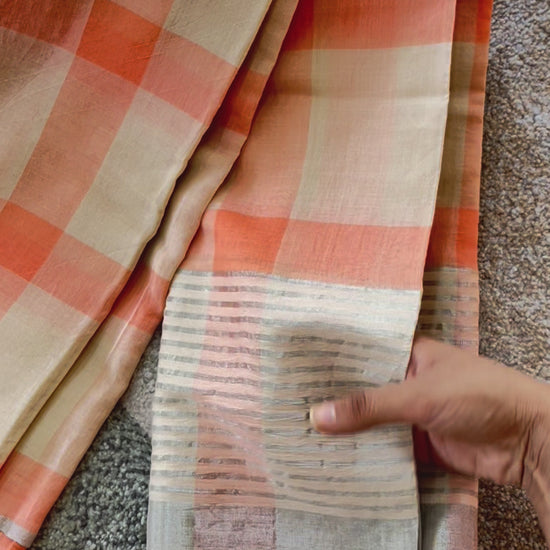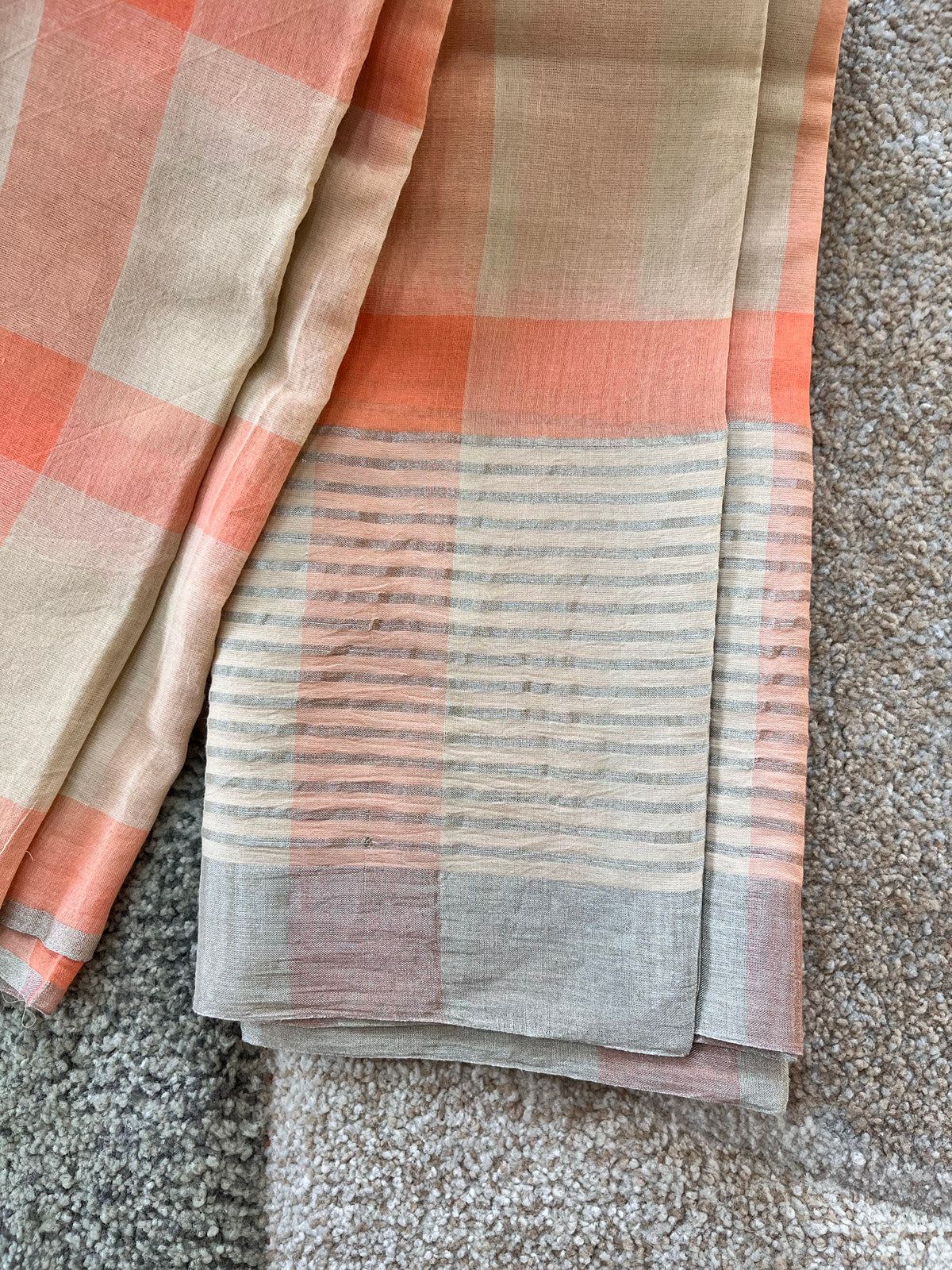 Handwoven Cotton Extrasoft saree in peach color with checks