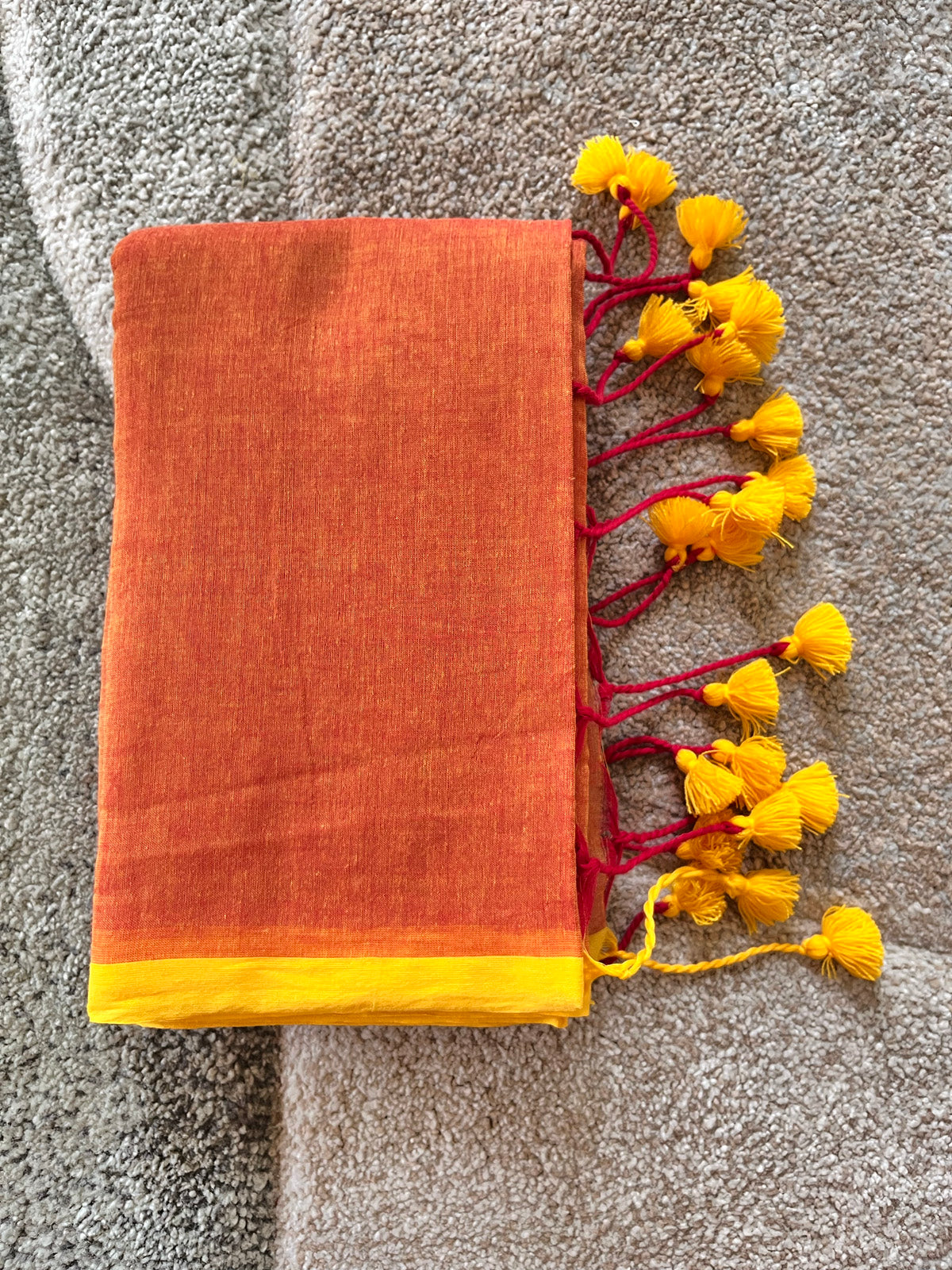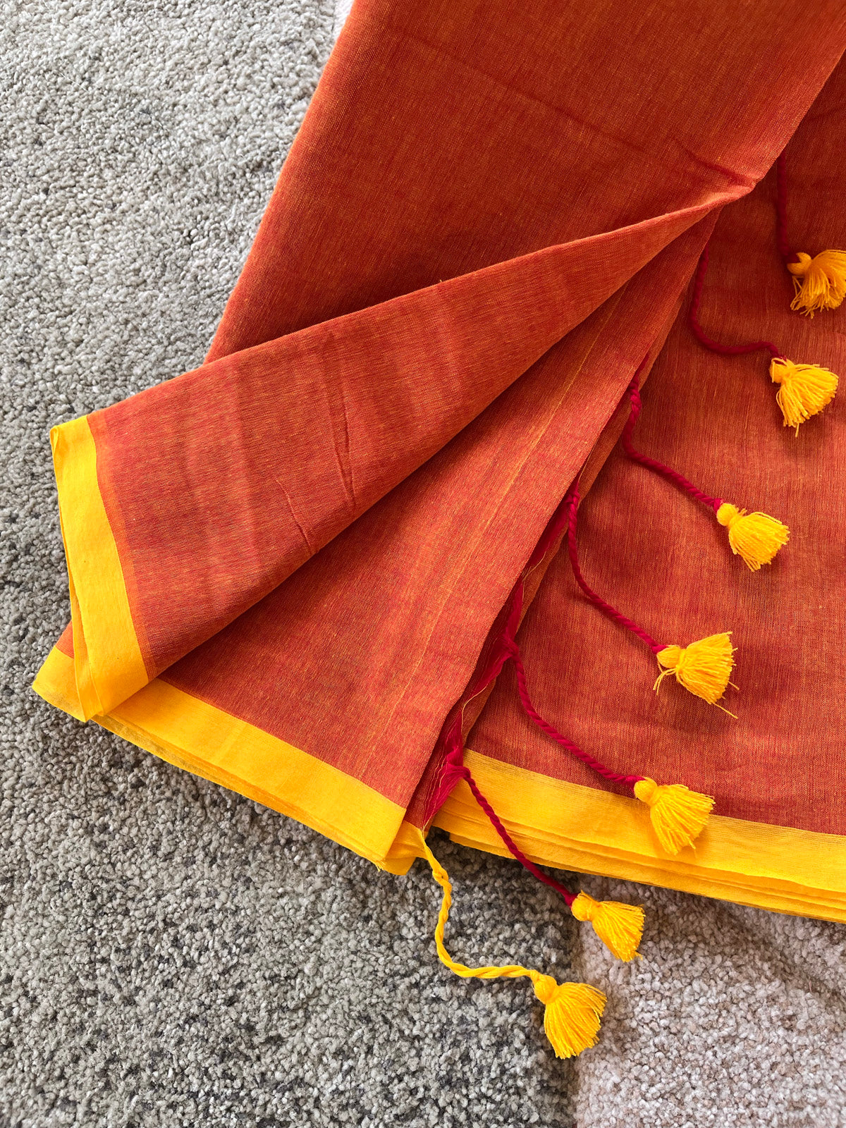 Orange Soft Mulmul Cotton Saree with contrast yellow border and tassel