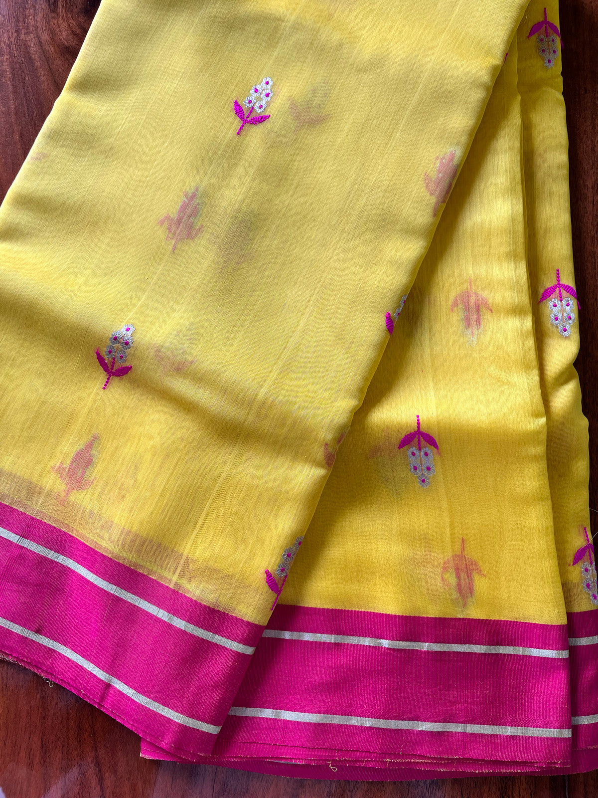 Fresh Bright yellow Chanderi with silver pink zari butis